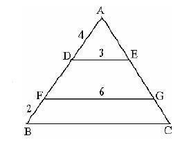 Дано треугольник АВС стороны DE и FG параллельны стороне ВС. Если стороны DE=3 см FG=6 см FB=2 см и AD=4 см, то найдите сторону ВС ?