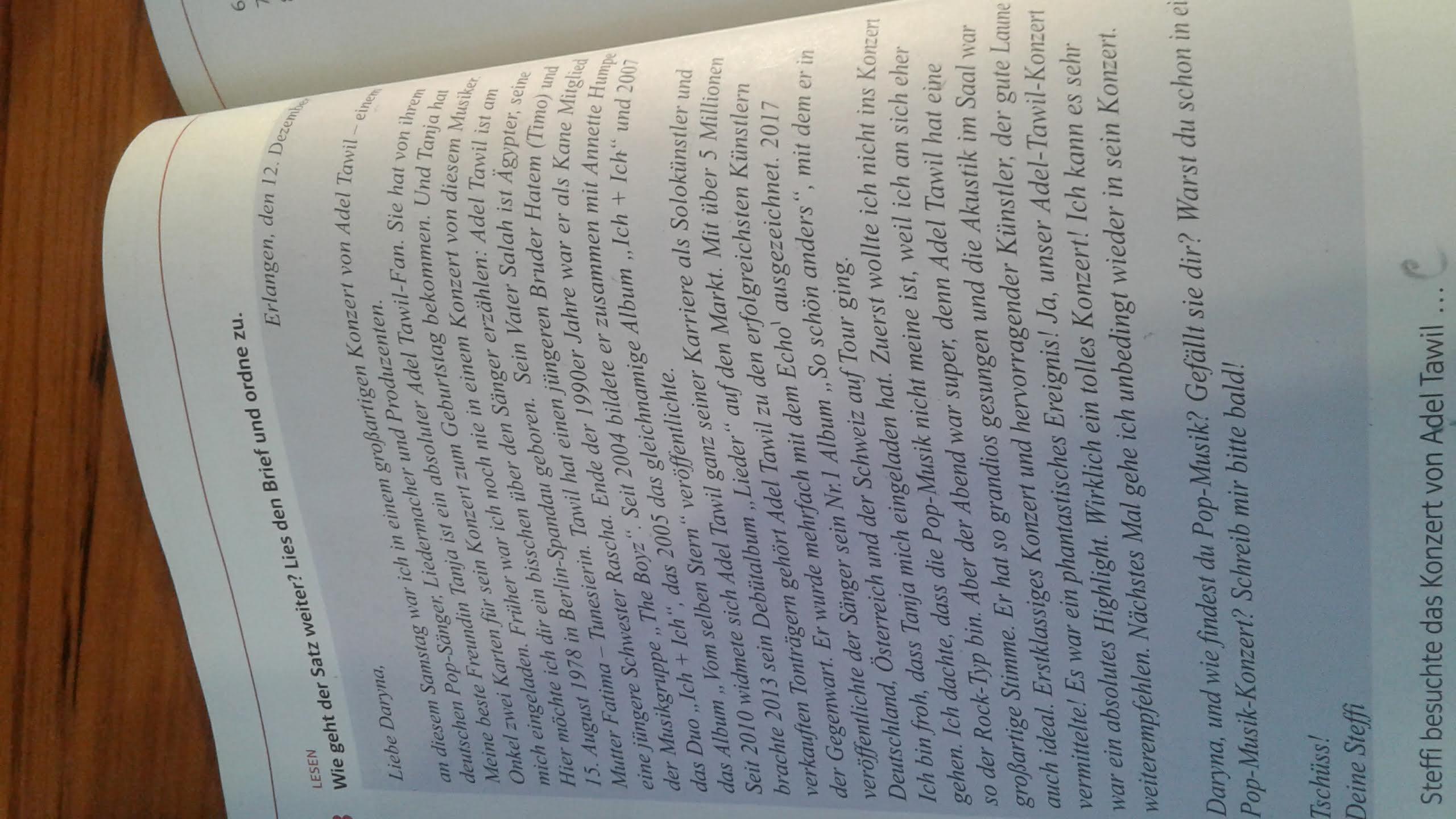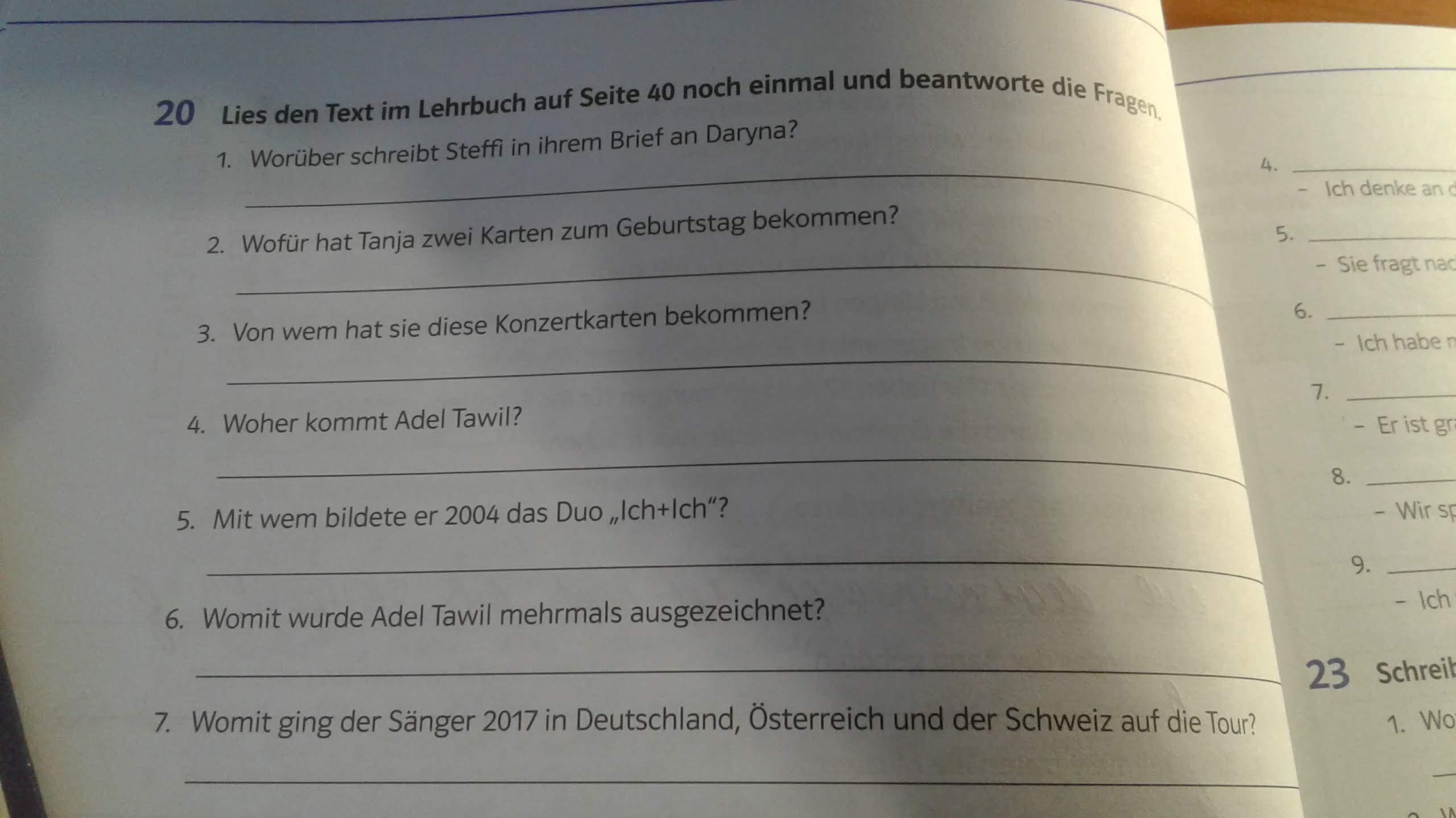 1. In ihrem Brief an Daryna schreibt Steffi über den deutschen Pop-Sänger, Liedermacher und Produzenten – Adel Tawil, den (которого) sie im Konzert gesehen hat. (видела)
