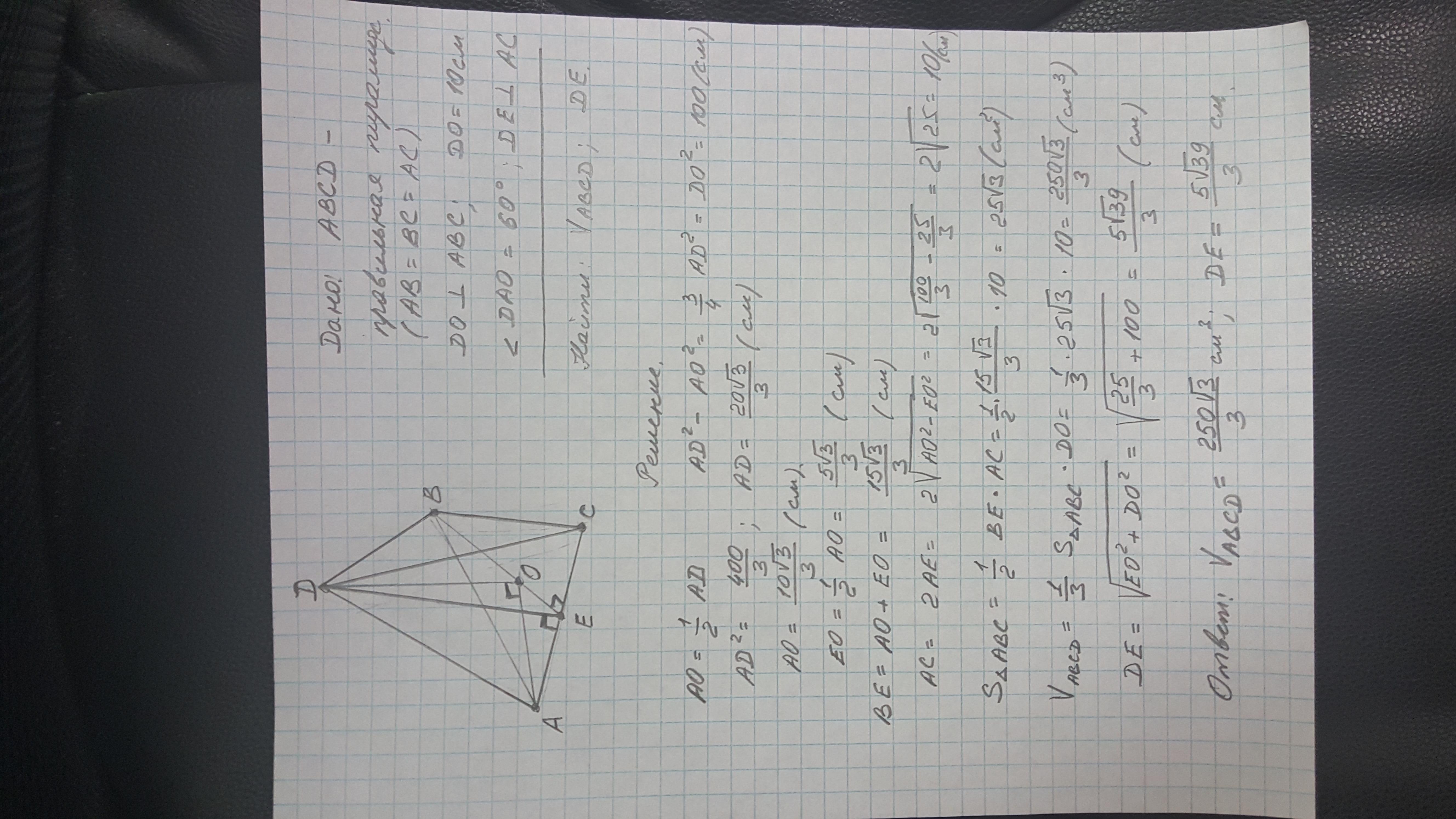 В правильной треугольной пирамиде высота равна 10 см, а угол между боковым ребром и плоскостью основания равен 60 градусов. Вычислите объём пирамиды и апофему.