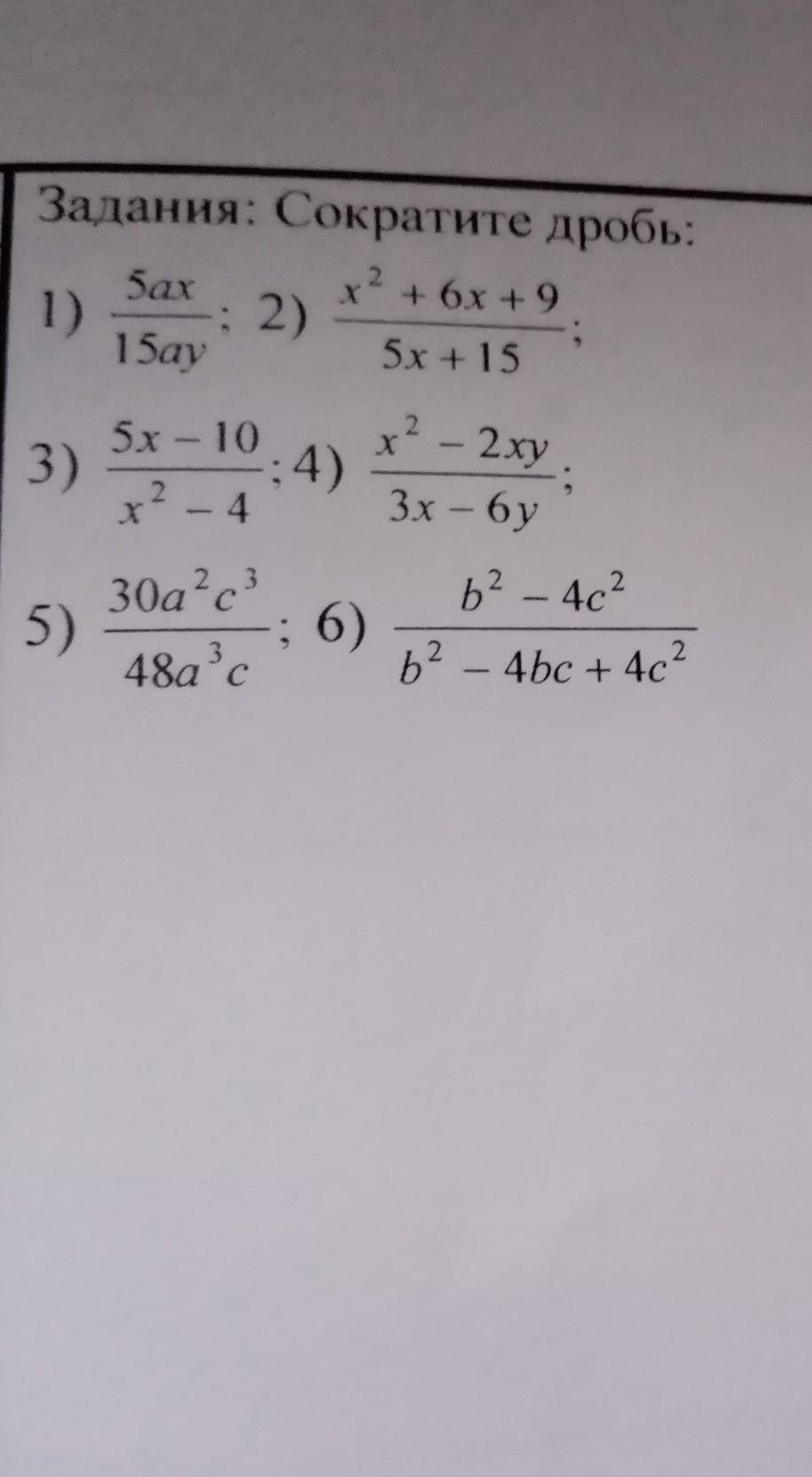 1)\;\frac{5ax}{15ay}=\frac x{3y};\\\\2)\;\frac{x^2+6x+9}{5x+15}=\frac{(x+3)^2}{5\cdot(x+3)}=\frac{x+3}5;\\\\3)\;\frac{5x-10}{x^2-4}=\frac{5(x-2)}{(x+2)(x-2)}=\frac5{x+2};\\\\4)\;\frac{x^2-2xy}{3x-6y}=\frac{x(x-2y)}{3(x-2y)}=\frac x3;\\\\5)\;\frac{30a^2c^3}{48a^3c}=\frac{5c^2}{8a};\\\\6)\;\frac{b^2-4c^2}{b^2-4bc+4c^2}=\frac{(b+2c)(b-2c)}{(b-2c)^2}=\frac{b+2c}{b-2c}.