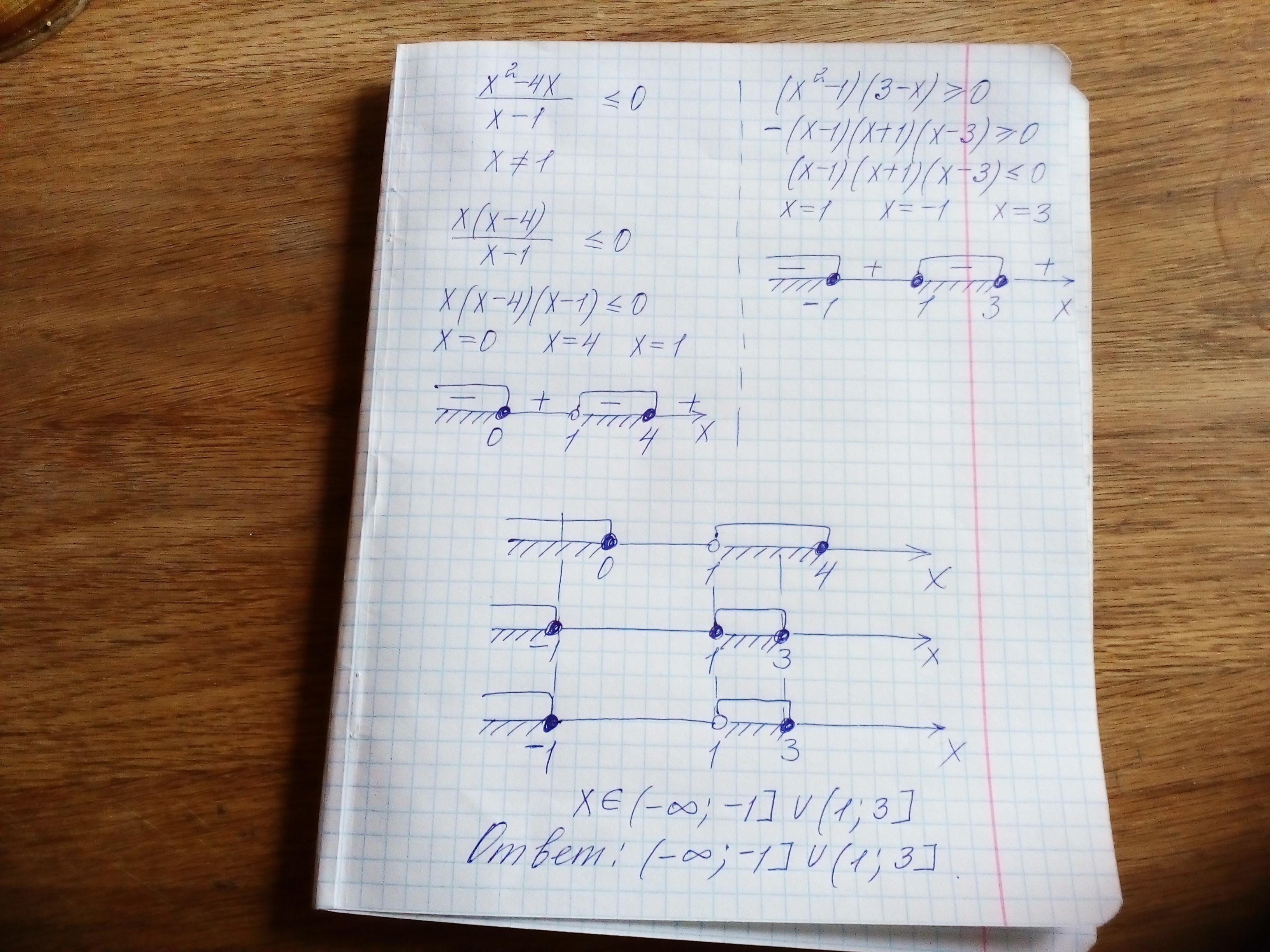 найдите все решения неравенства x^2-4x/x-1<=0, которые удовлетворяют неравенству (x^2-1)(3-x)>=0.