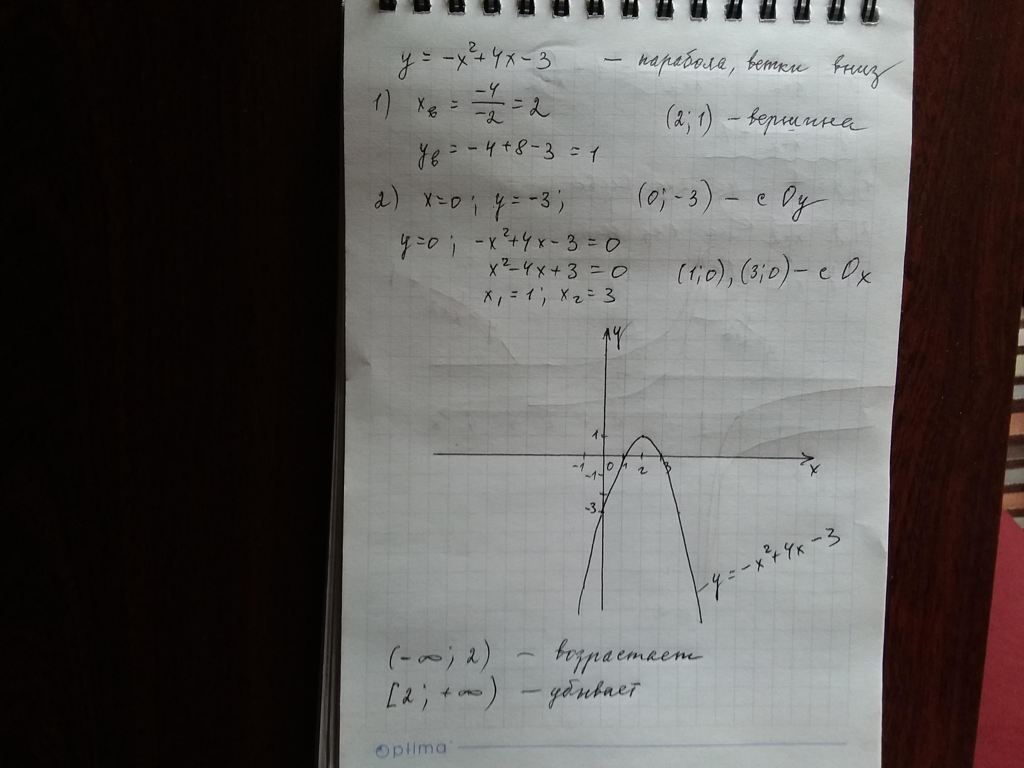 Постройте график функции y=-x^2+4x-3. Найдите промежуток возрастания и промежуток спадания функции