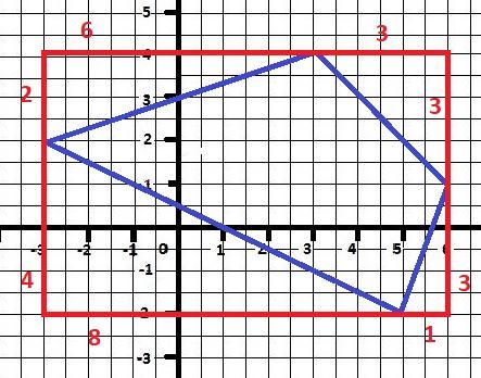 Четырехугольник окружаем прямоугольником и из его площади вычитаем площадь четырех получившихся треугольников.