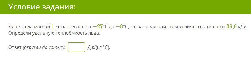 Кусок льда массой 1 кг нагревают от −27°C до −8°C, затрачивая при этом количество теплоты 39,9 кДж. Определи удельную теплоёмкость льда.