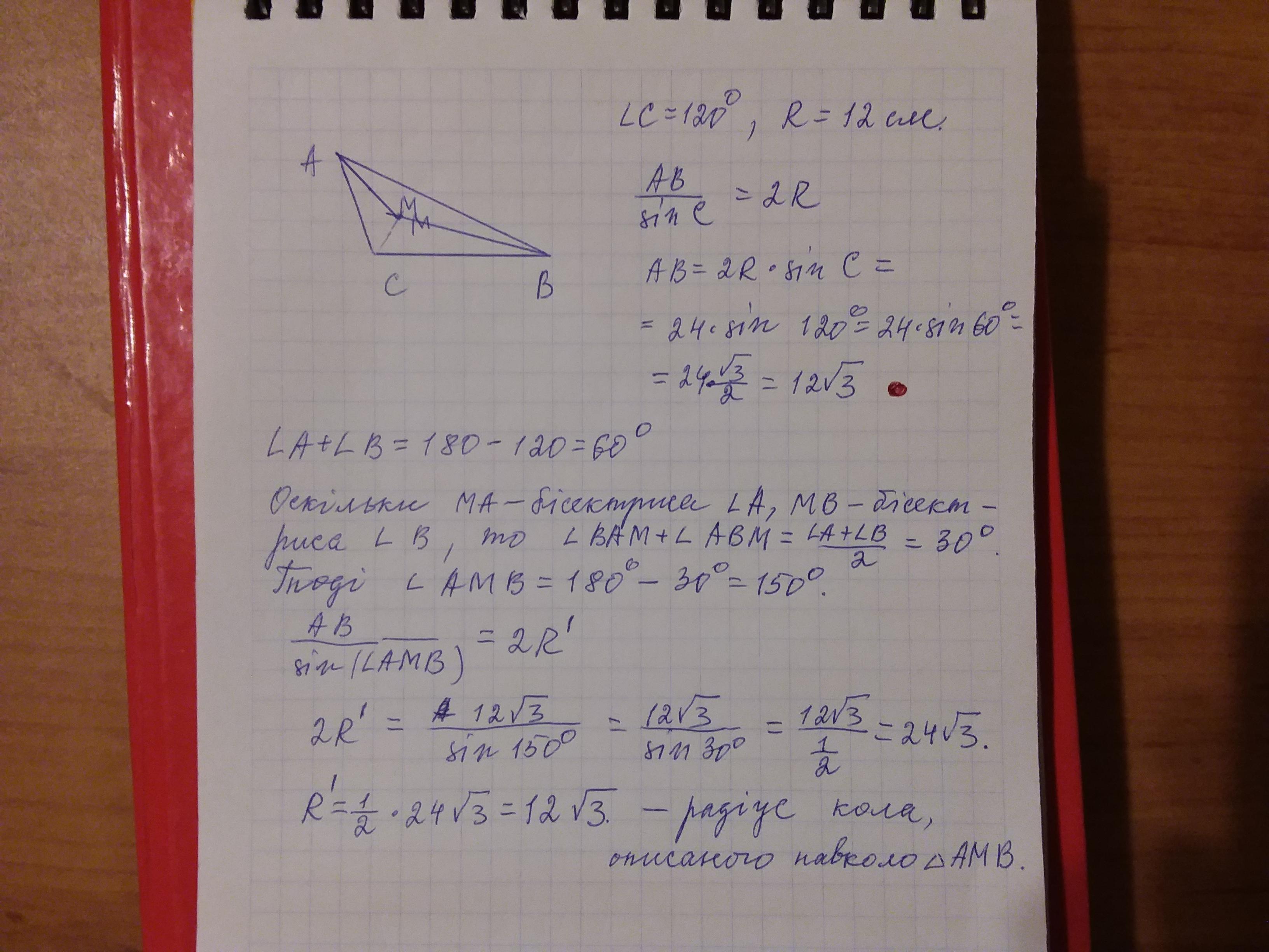 У трикутнику ABC відомо, що кут C=120°, M - точка перетину бісектрис. Радіус кола, описаного навколо трикутника ABC, дорівнює 12 см. Знайдіть радіус кола, описаного навколо трикутника AMB.