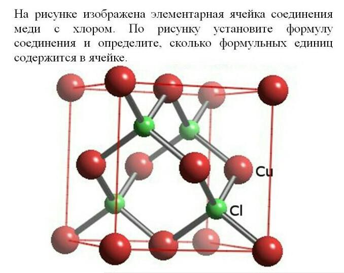 На 1 атом меди приходится 1 атом хлора, т.е. формульная единица СuCl. И таких формульных единиц в ячейке 4.