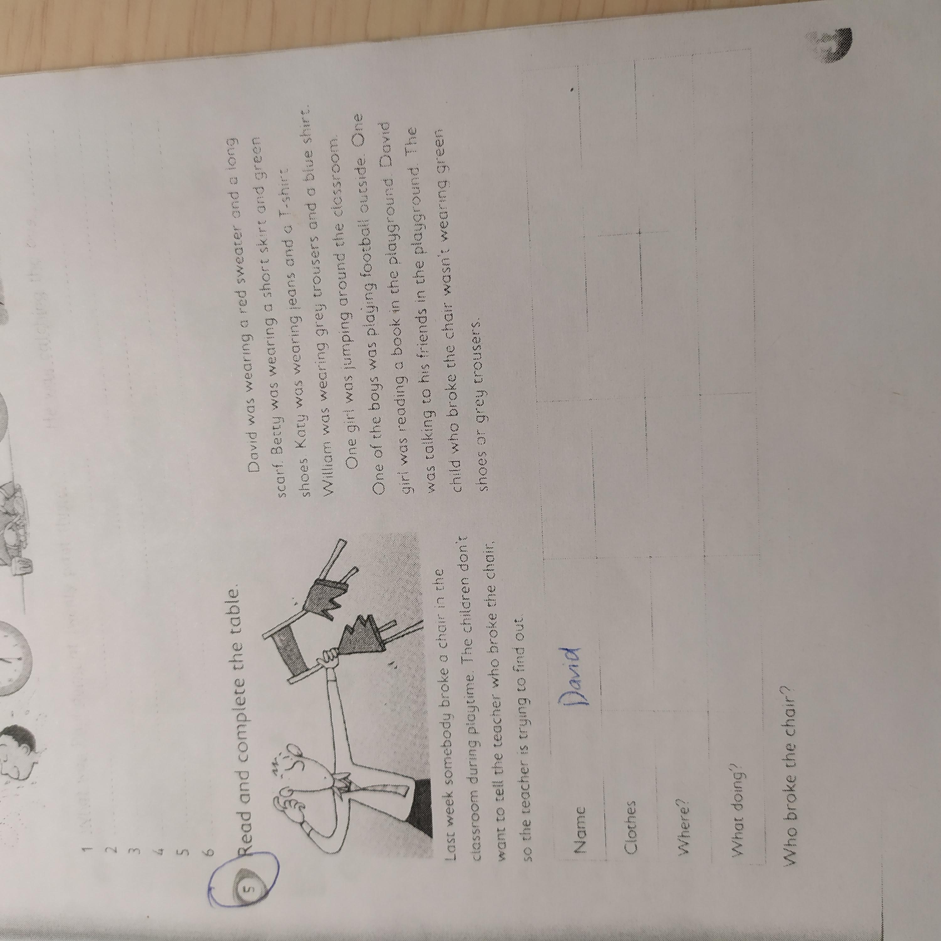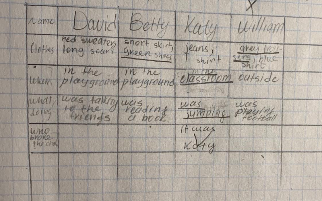Katy broke the chair, cause she was jumping in the classroom at that moment and she wasn’t in green shoes or grey trousers.