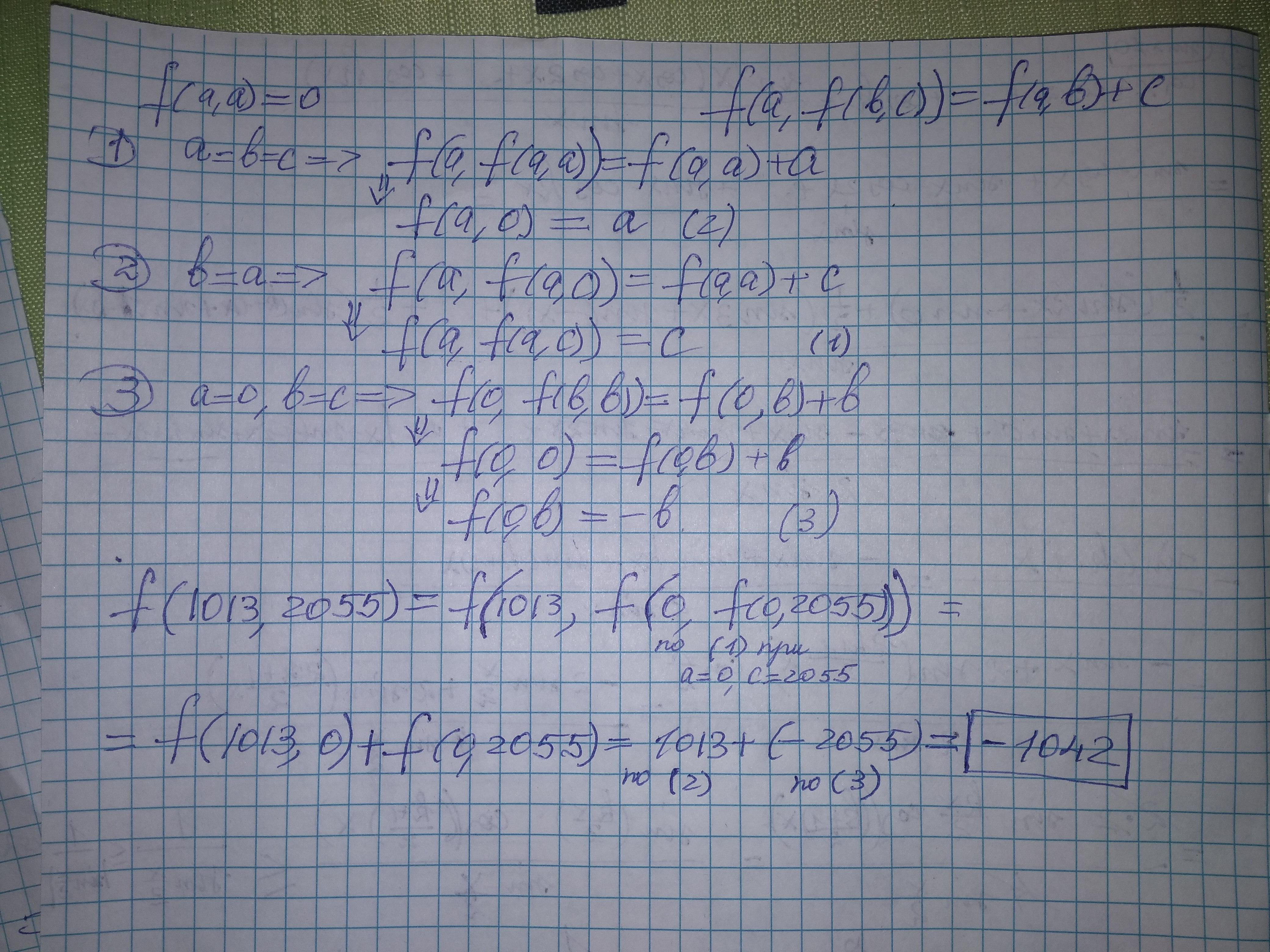 На координатной плоскости каждой точке с координатами (a,b) поставили в соответствие число f(a,b). Оказалось, что для любых чисел a, b, c выполняются равенства: f(a,a)=0,f(a,f(b,c))=f(a,b)+c. Найдите f(1013,2055).