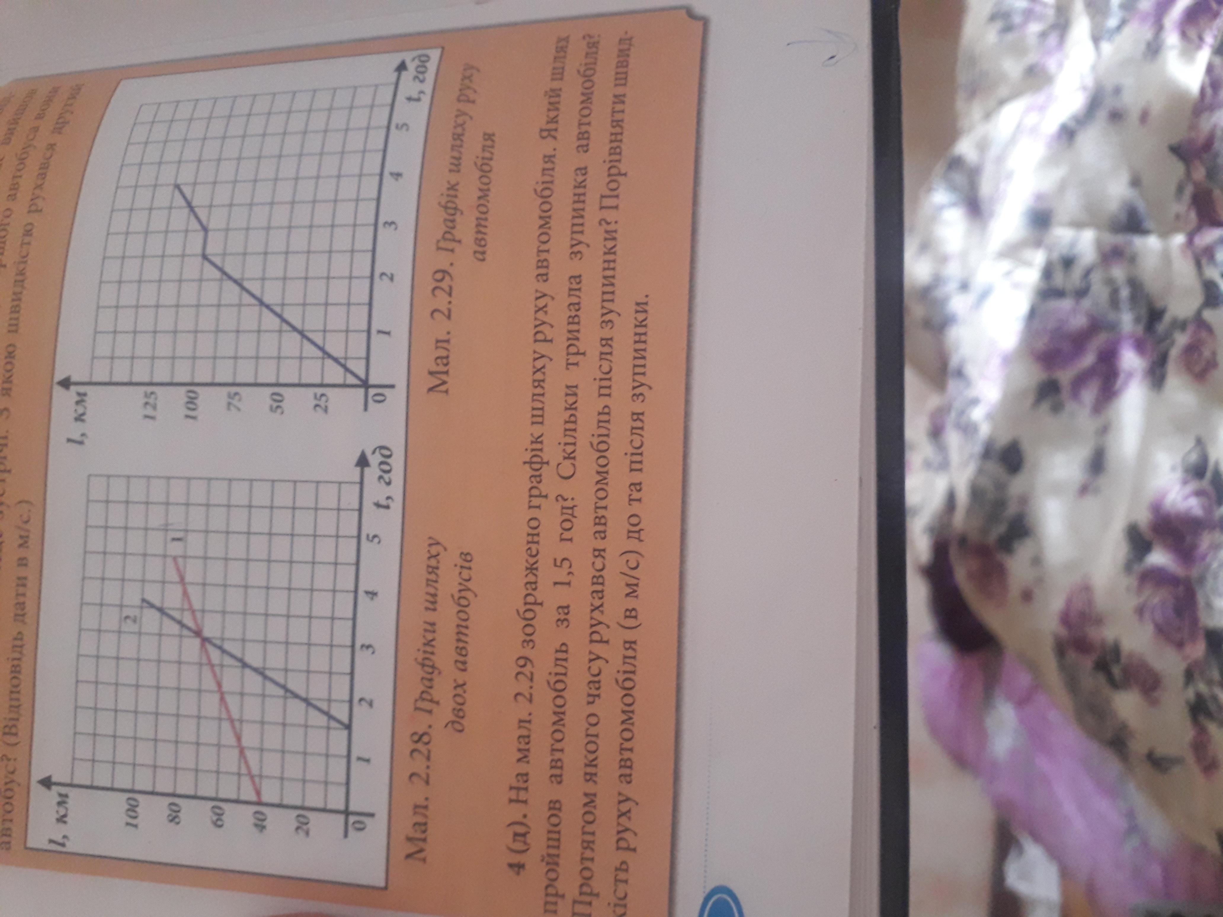 За 1,5 год, автомобіль пройшов 60 км ( дивимось на графік, 1, 5 год ( t, год ), точка, на якій позначка перетинається з лінією графіка - це коефіцієнт пройденого шляху (l, км)). Лінія графіку, яка не рухається по вертикалі - це відрізок, на якому автомобіль перебував у стані нерухомості, рухався лише час, швидкість автомобіля у цей час дорівнювала 0, дивимось скільки ця лінія пройшла по горизонталі, у нашому випадку від 2, 5 год, до 3 год, отже зупинка тривала 0, 5 год. Далі лінія графіку знов почала рухатись, дивимось де вона зупинилась, визначаємо точку перетину по горизонталі зі шкалою (l, км), дізнаємось скільки проїхав автомобіль, у нашому випадку - від 100 км, до 125 км, отже ( 125 км - 100 км) після зупинки він проїхав 25 км. Порівнюємо швидкість руху автомобіля до та після зупинки: визначаємо швидкість в км/год за графіком руху, до зупинки він проїжджав 40 км/год (t1), а після - 25 км (t2), t1 - t2 = 40 км/год - 25 км/год = 15 км/год, отже до зупинки він їхав на 15 км швидше.