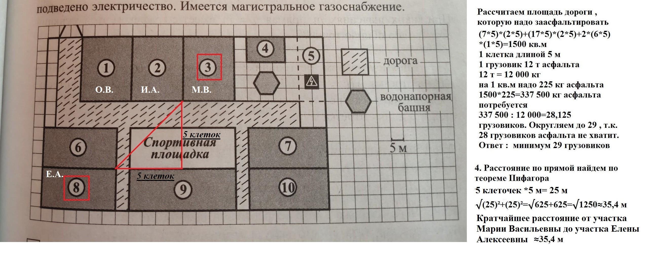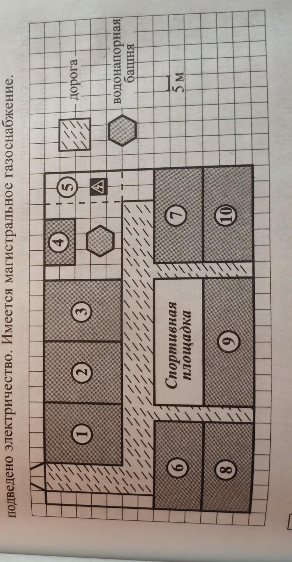 На плане изображён дачный посёлок, расположенный на территории прямоугольной формы (сторона каждой клетки на плане равна 5 м). Выезд и въезд осуществляются через единственные ворота. Прямо напротив ворот расположен участок Натальи Николаевны. При входе в посёлок слев от ворот находится участок Ольги Владимиронны. Смежный с ним участок принадлежит Инне Александровне. В посёлке имеется водонапорная башня, а прямо за ней котельная площадью 150 кв. м. Рядом с котельной находится участок Марии Васильевны. Участок Сергея Семёновича расположен напротив водонапорной башни и трансформаторной будки, обозначенной цифрой 5. Смежный с ним участок принадлежит Петру Ивановичу. Андрей Викторович прямо перед своим участком обустроил открытую для всех спортивную площадку. Через дорогу напротив участка Андрея Викторовича находится участок Елены Алексеевны. К посёлку подведено электричество. Имеется магистральное газоснабжение.