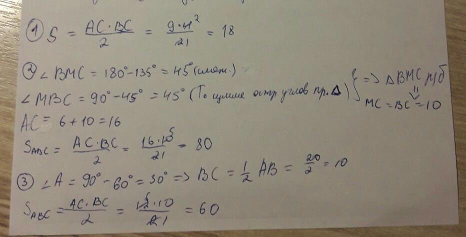угол mbc = углу bmc = 45, равнобедренный треугольник. ас = 6+10=16. 1/2 * 16 * 10 = 80
