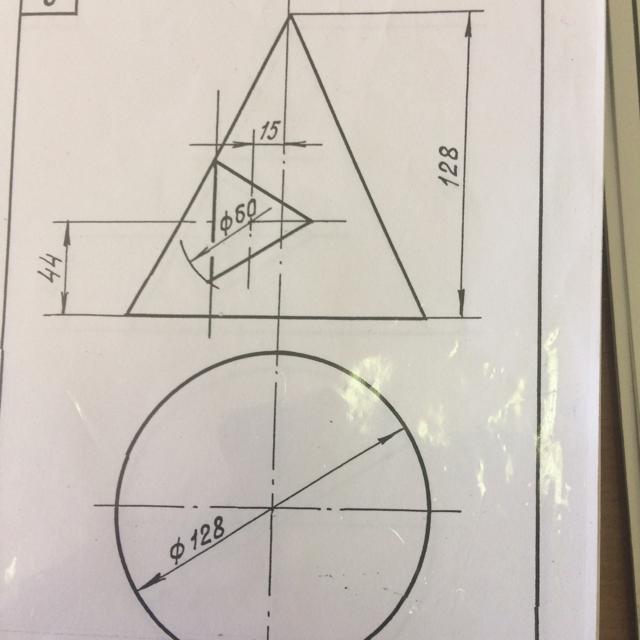 Помогите выполнить построение трех проекций конуса со сквозным призматическим отверстием. Отправьте картинку как правильно должно быть(могу заплатить)
