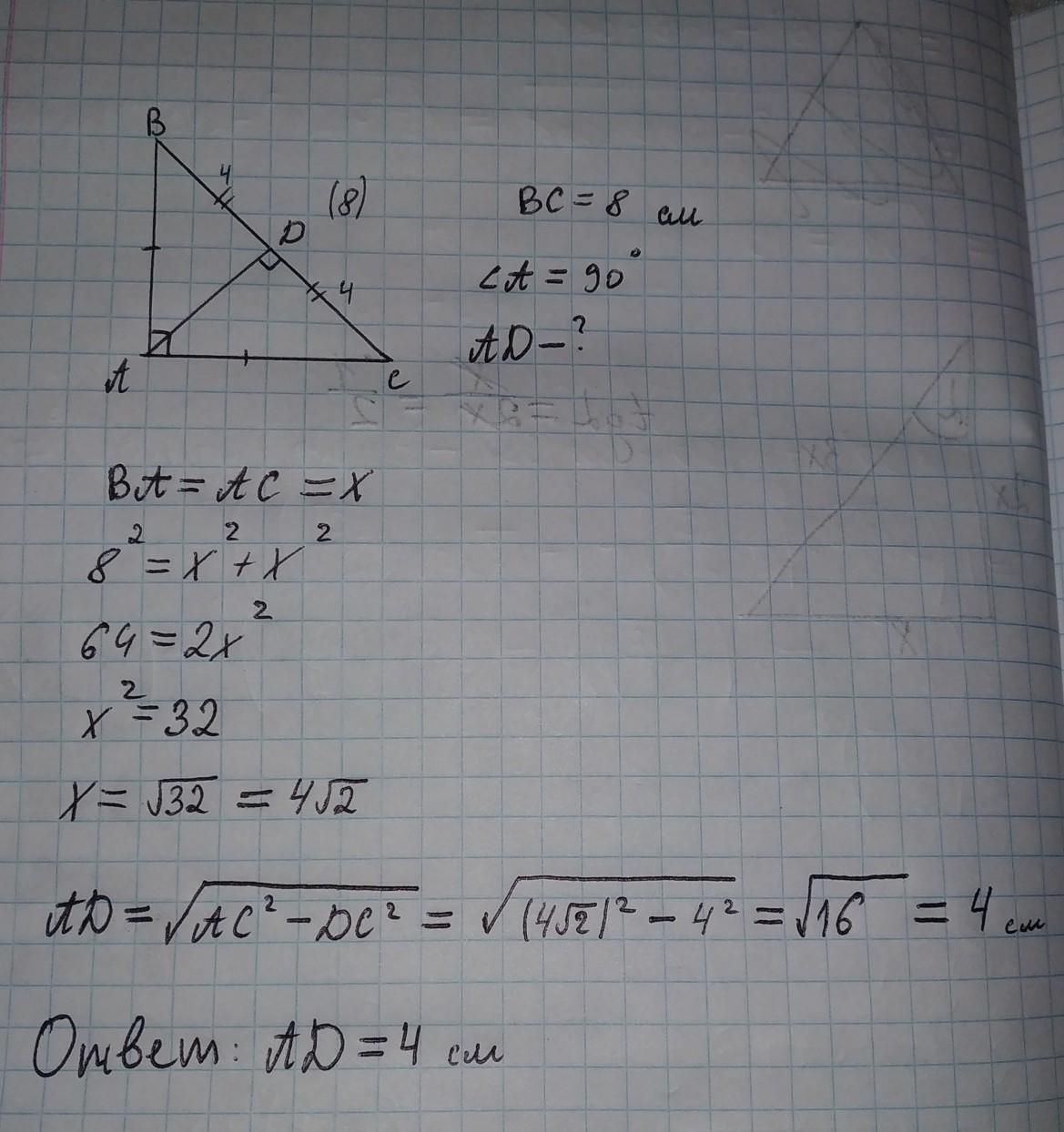 Основание равнобедренного треугольника 8 см, а угол при вершине 90гр. Найдите длину высоты, опущенной на основание.
