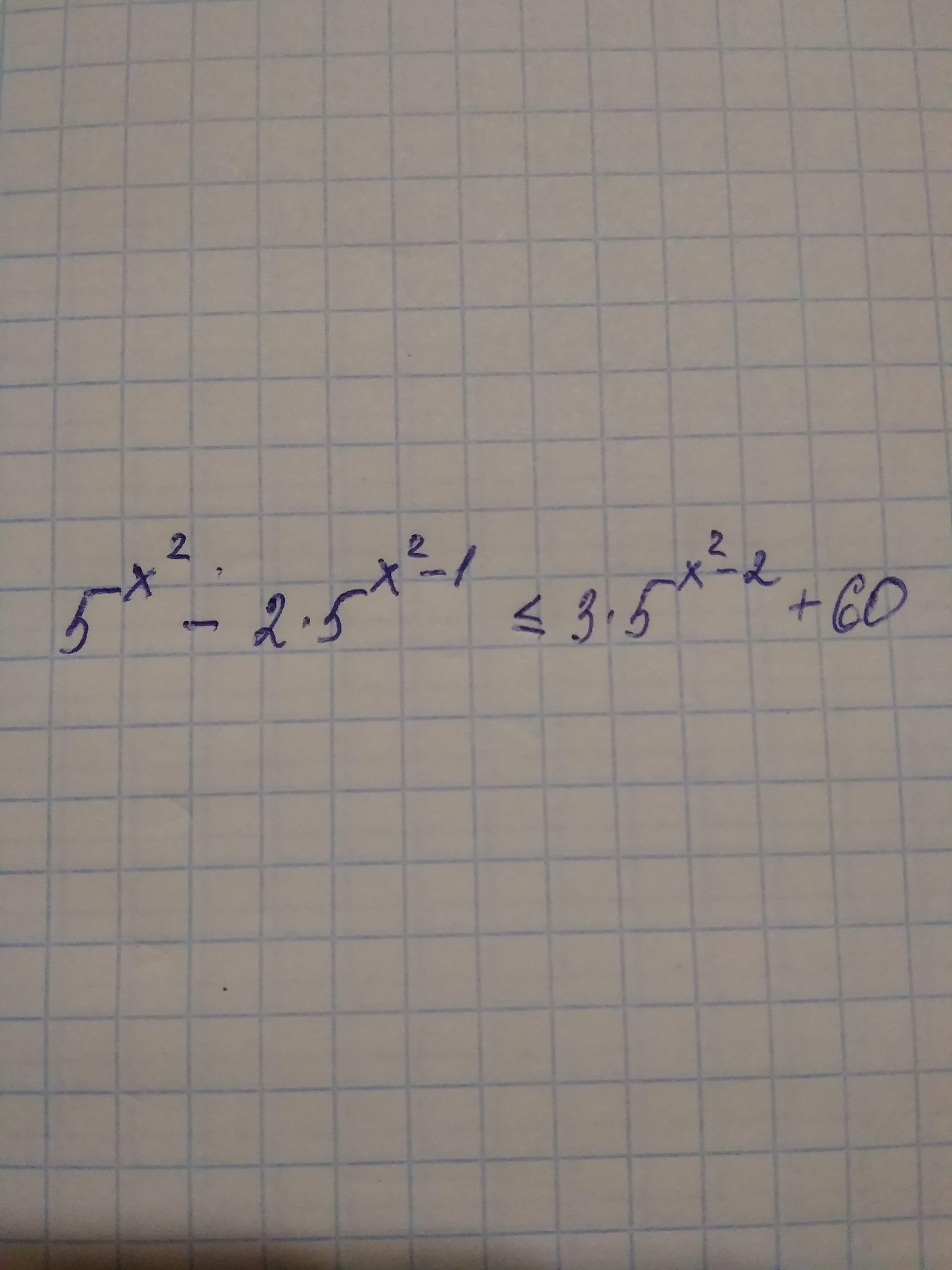 5^{x^{2}}-2*5^{x^{2}-1}\leq 3*5^{x^{2}-2}+60\\\\5^{x^{2}}-2*5^{x^{2}-1}-3*5^{x^{2}-2}\leq60\\\\5^{x^{2}-2}(5^{2}-2*5-3*1)\leq60\\\\5^{x^{2}-2}*12\leq60\\\\5^{x^{2}-2 }\leq5
