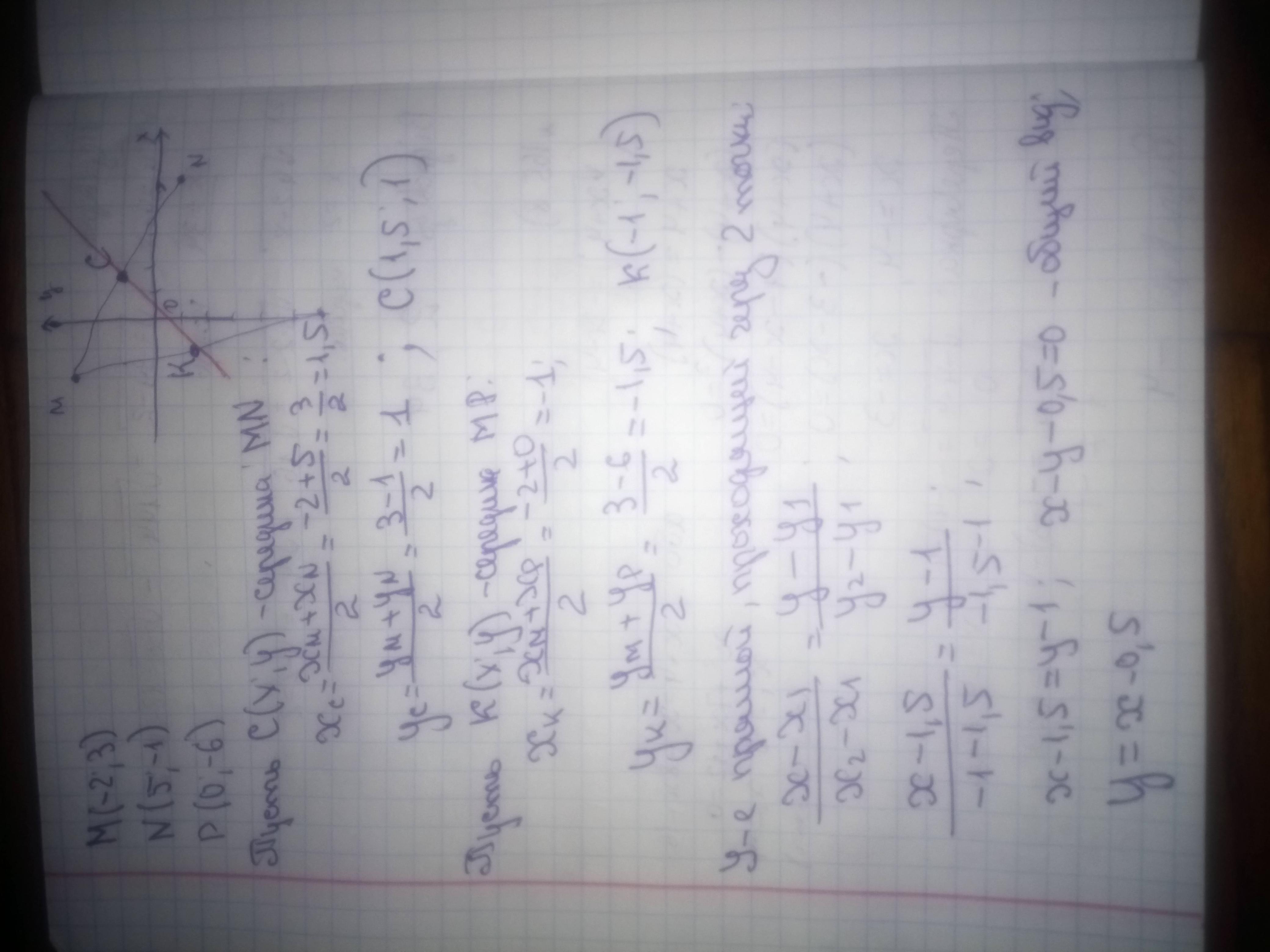 Написать уравнение прямой,проходящей через середины отрезков MN и MP,если M(-2;3),N(5;-1),P(0;-6)
