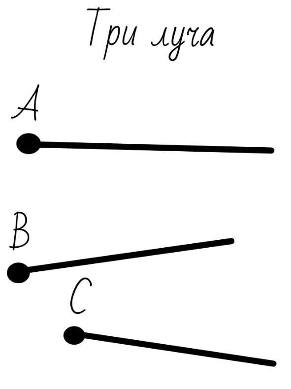 Это же элементарно. Прямая не отделена точками, не имеет начала и конца. Луч имеет начало (точку), но не имеет конца. Отрезок отделен с двух сторон точками, имеет начало и конец.