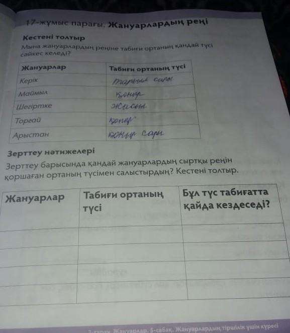 16-жұмыс парағы. Менің сүйікті жануарымӨзіңнің сүйікті жануарың туралы айт. Кестені толтыр.қандай?қызықты дерек білесің?қоршаған ортаның түсімен салыстырдың? Кестені толтыр.қайда кездеседі.