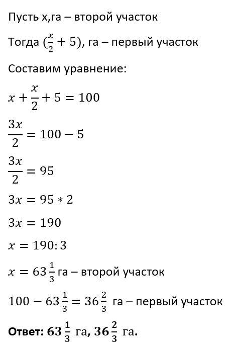 Поле площадью 100 га поделили на 2 участка так, что площадь первого на 5 га больше половины второго. Найти площадь каждого участка.