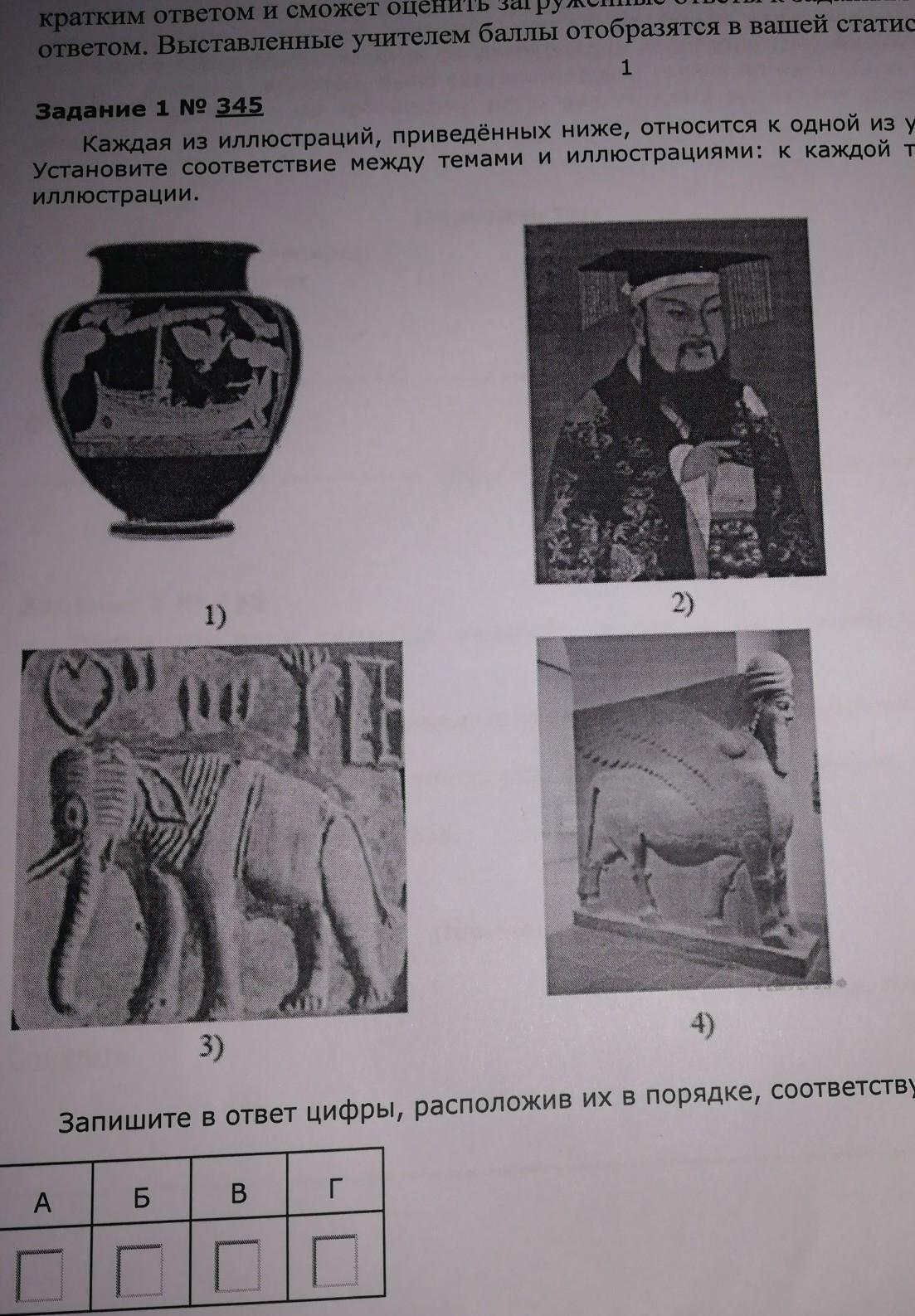каждая из иллюстраций, приведённых ниже, относится к одной из указанных в перечне тем. Установите соответствие между темами иллюстрациями:каждой теме подберите по одной иллюстрации. Запишите в ответ цифры расположив их в порядке соответствующем буквам: А, Б, В, Г (перечни тем:древняя греция, ассирийское государство, древний китай, древняя Индия