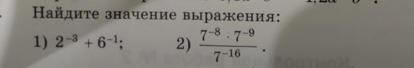 2^-3 +6^-1=(1/2)³+(1/6)^1=1/8+1/6=(3+4)/24=7/24