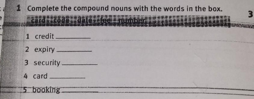 complete the compound nouns with the words in the box. Card,code,date,fee, number. 1. credit ______. 2.expiry ______. 3. security _______. 4. card _______. 5. booking ________.