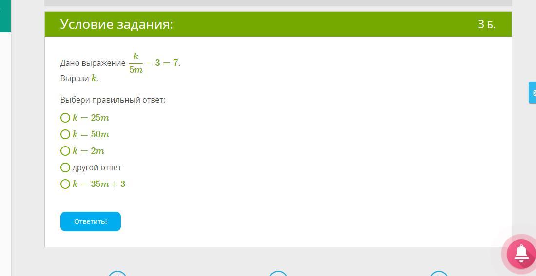 \frac{k}{5m}  - 3 = 7 \\  \frac{k}{5m}  = 10 \\  \frac{k}{m}  = 50 \\ k = 50m