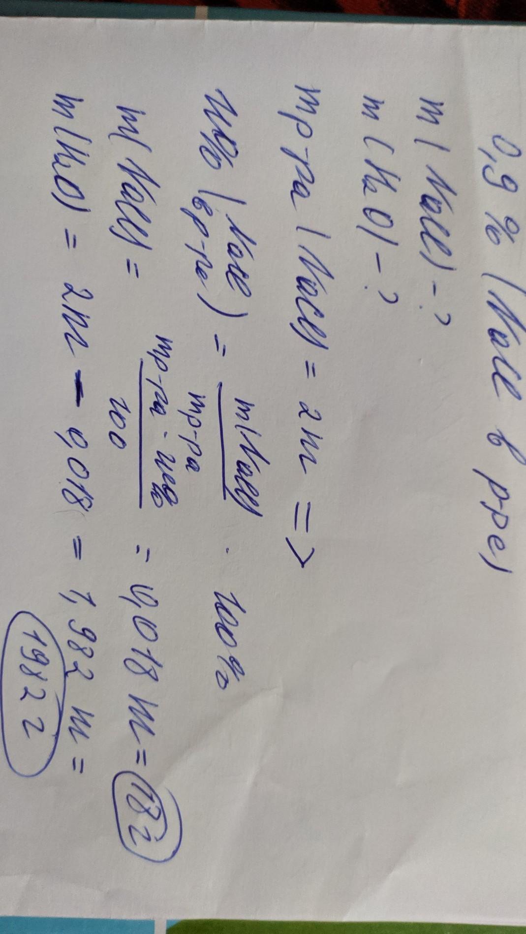 Пожалуйста объясните как решать!!!!!Физиологический раствор -0,9% -Хлорида Натрия. Установите массу поваренной соли и воды, которые следует взять для приготовления 2кг Физиологического раствора.