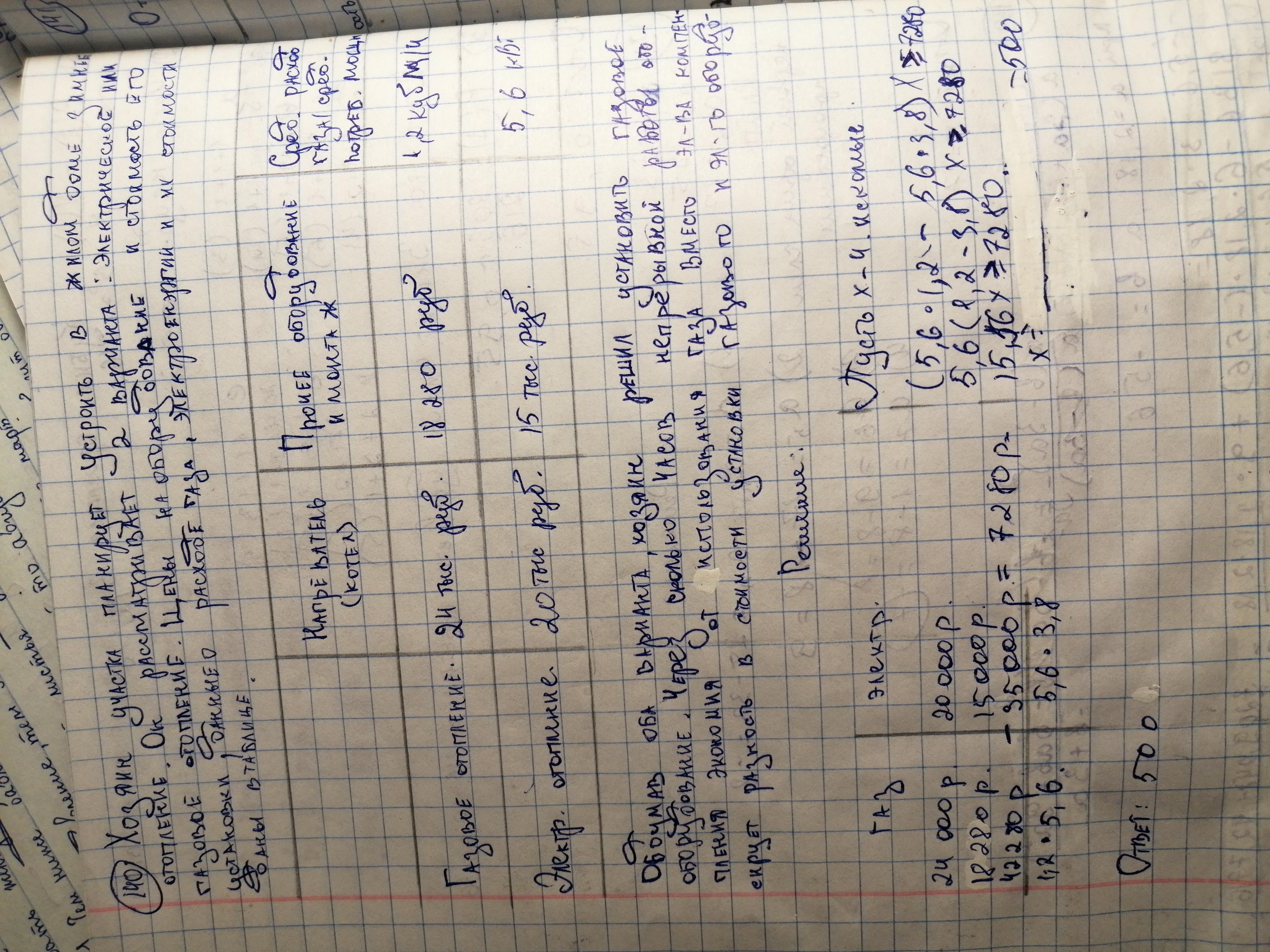 Хозяин участка планирует установить в жилом доме систему отопления. Он рассматривать вариант электронных или газовое отопления. Цены на оборудование и стоимость его установки данные о расходе газа, электроэнергии их стоимости даны в таблице. Обдумав оба варианта хозяин решил установить газовое оборудование, через сколько часов непрерывной работы отопления экономия от использования газа вместо элктричество крлинерует разницы в стоимости установки газового и электрического оборудования