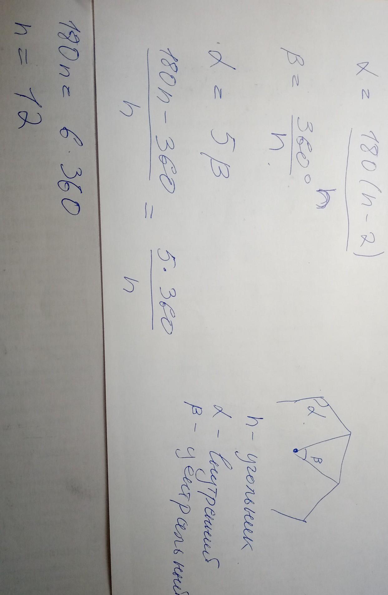 Сколько сторон имеет правильный многоугольник внутренний угол которого в 5 раз больше центрального угла