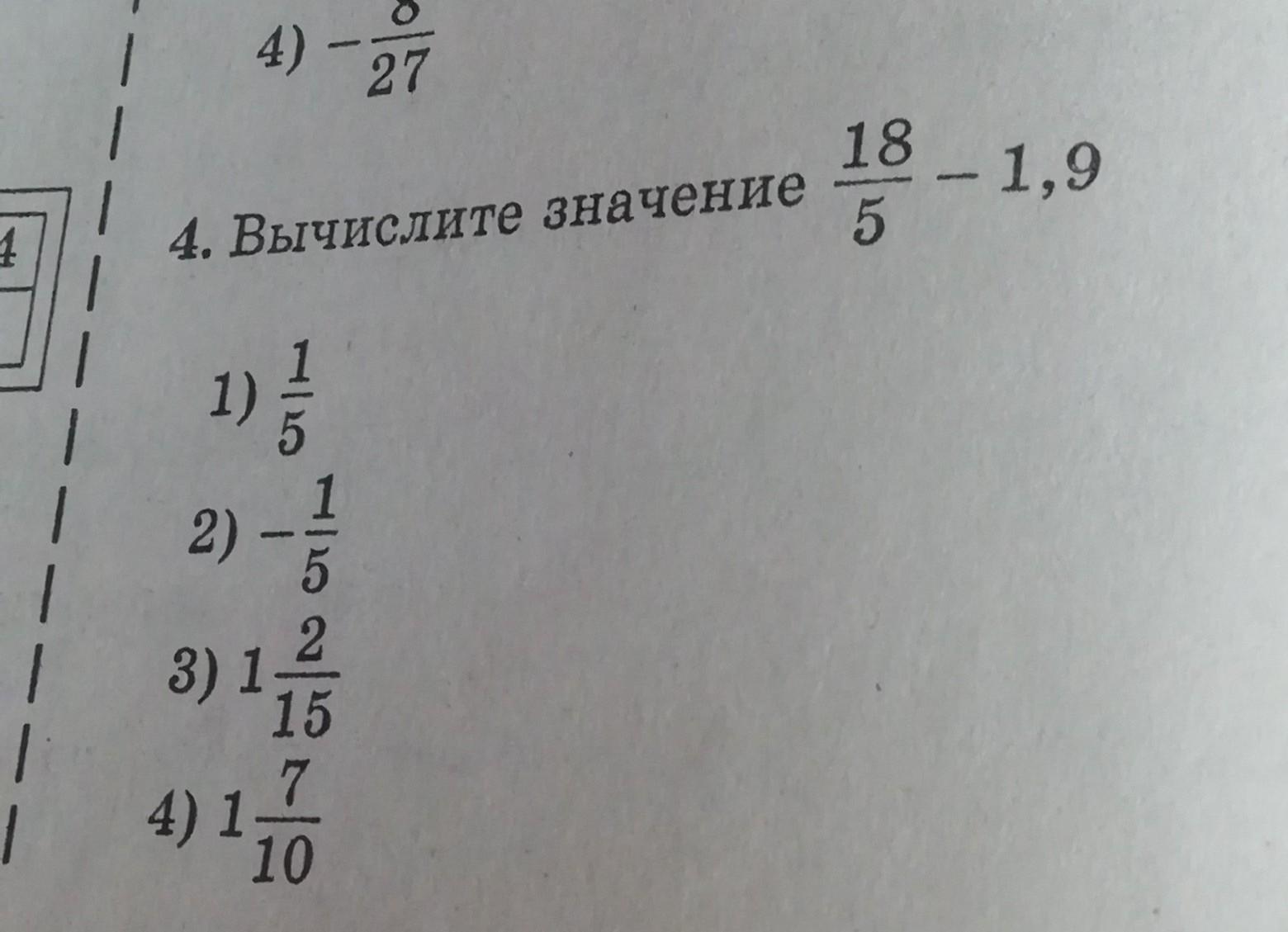 Объяснение: 18 / 5 - 1.9= 3.6 - 1.9 = 1.7 или 1 целая 7/10 ответ 4)