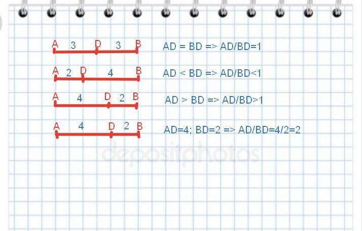 б)AD/BD<1 - когда разность от деления меньше 1, значит делимое меньше делителя AD<BD. Если AD=2, BD=4 (2+4=6), то 2/4=0.5; 0.5<1