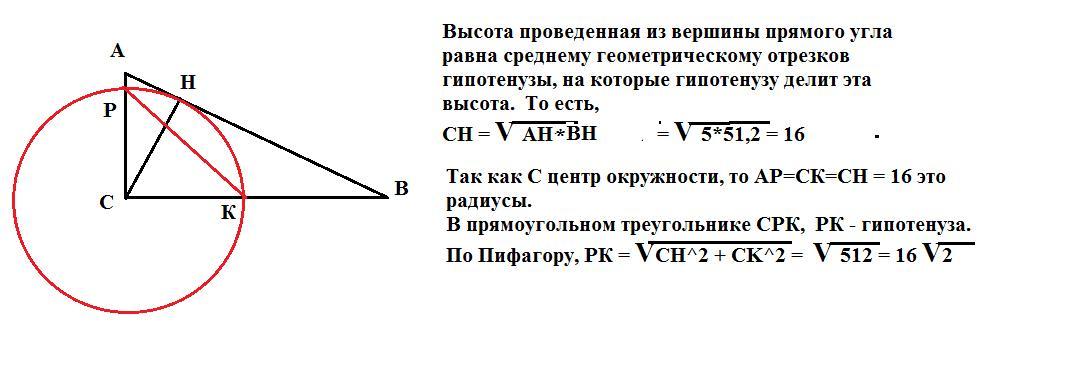 В прямоугольном треугольнике АВС высота СН делит гипотенузу АВ на отрезки АН = 5 и BH = 51,2. Окружность с радиусом СН и центром в точке С пересекает стороны АС и ВС в точках Р и К. Найдите длину отрезка РК.