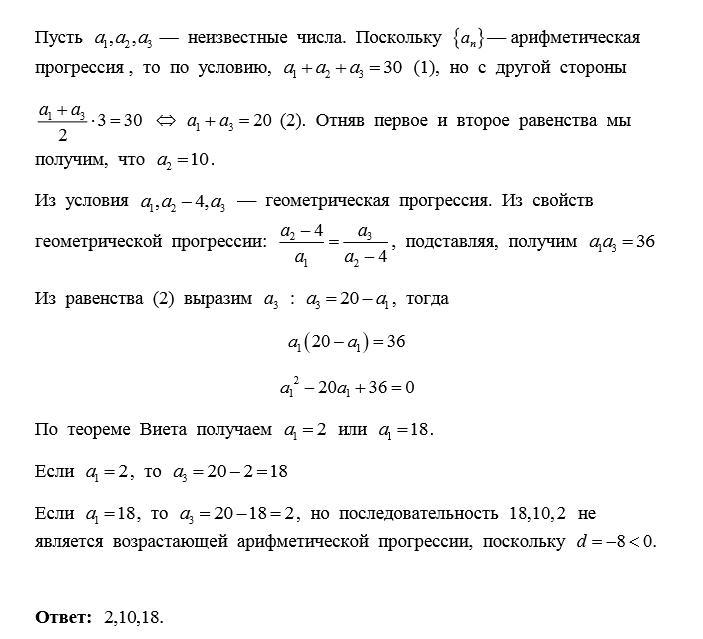 Сумма трех чисел составляющих возрастающую арифметическую прогрессию, равна 30. Если от второго числа отнять 4, а остальные числа оставить без изменений, то полученные числа составят геометрическую прогрессию. Найти эти числа. Варианты ответа