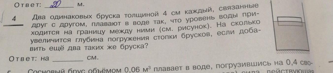 Глубина погружения 2-х брусков = 4 см, поскольку мы дбавим 2 таких же бруска, то глубина погружения станет 8 см, значит на 4 больше