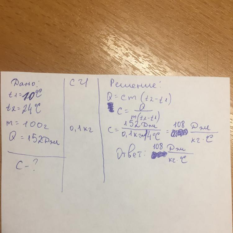 Переводим в СИ массу тела (100 г = 0,1 кг) и выражаем удельную теплоемкость: