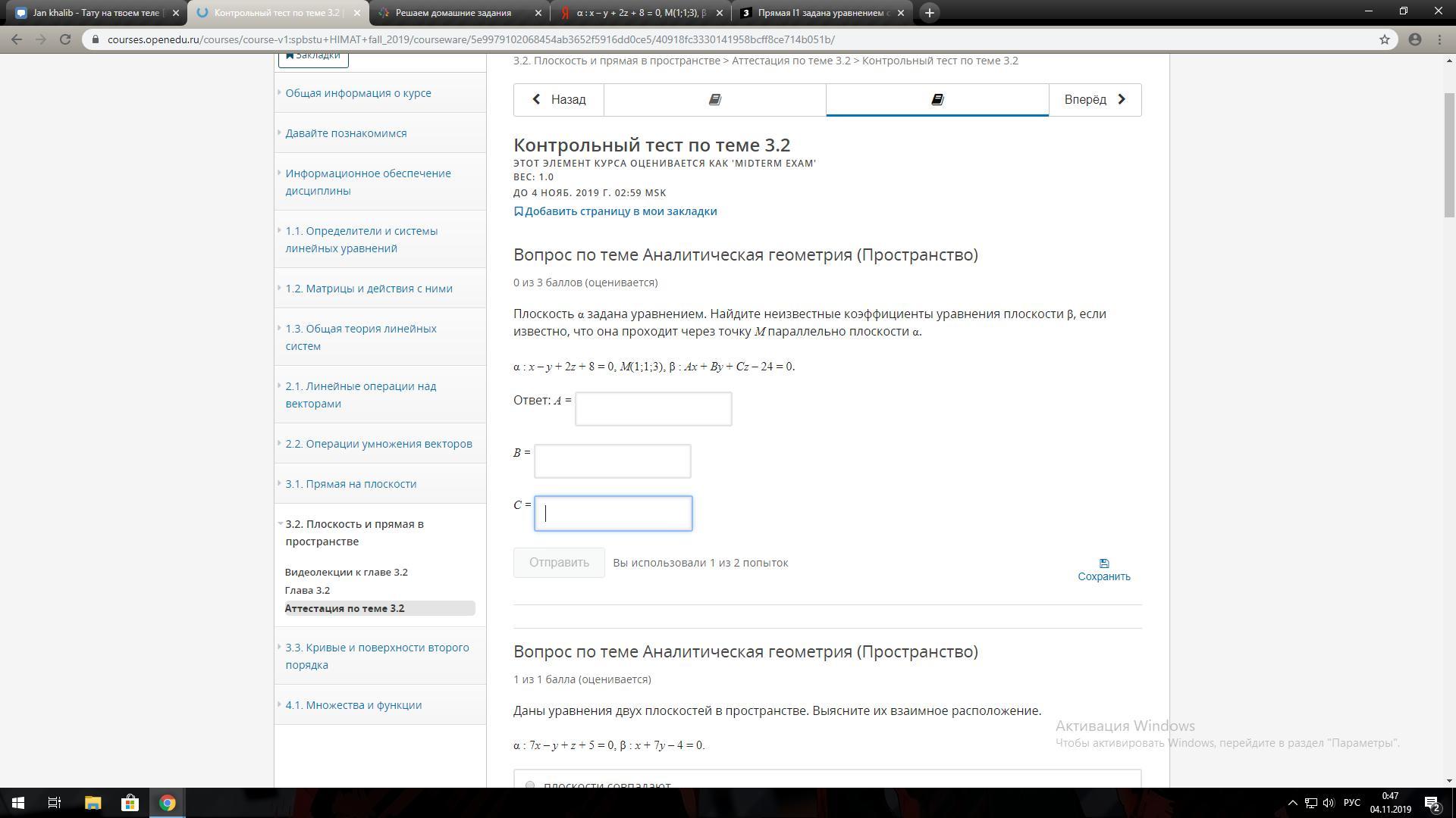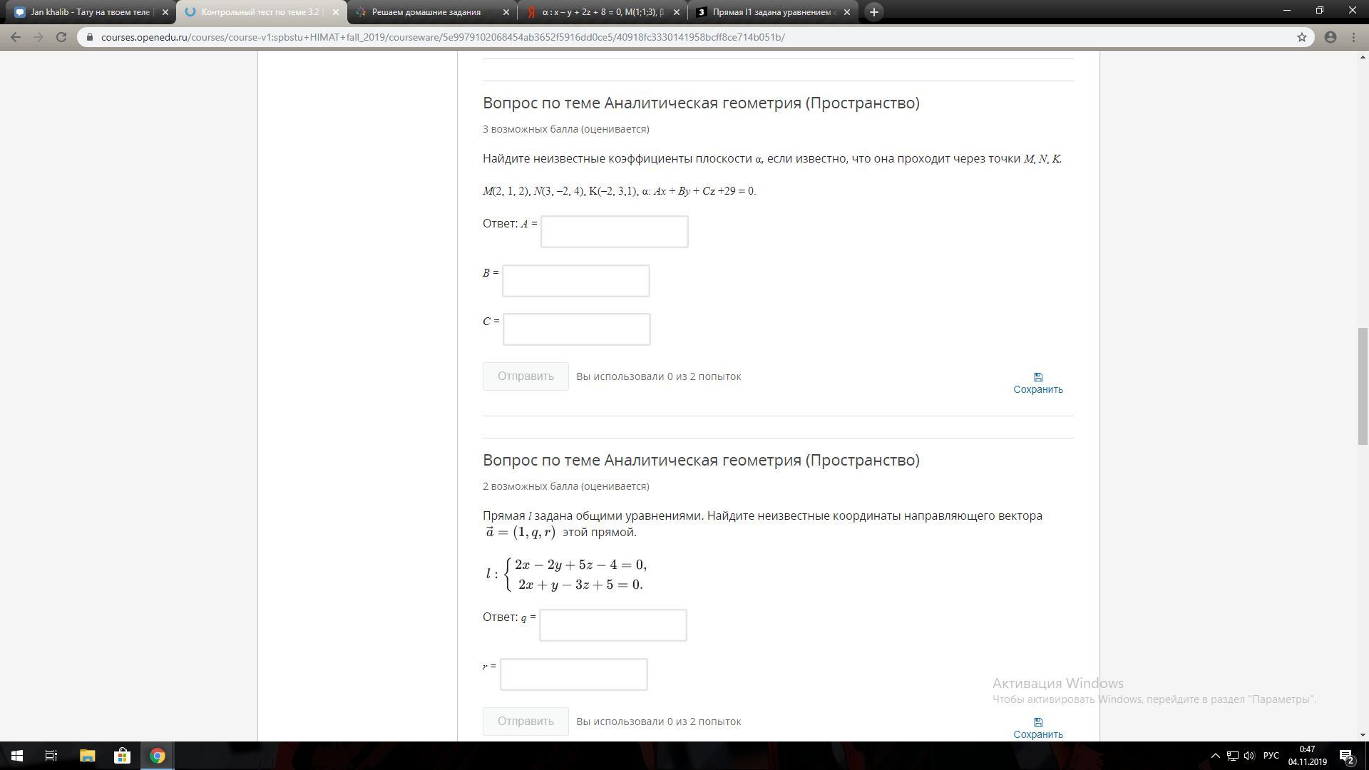 Найдите неизвестные коэффициенты плоскости α, если известно, что она проходит через точки M, N, K.