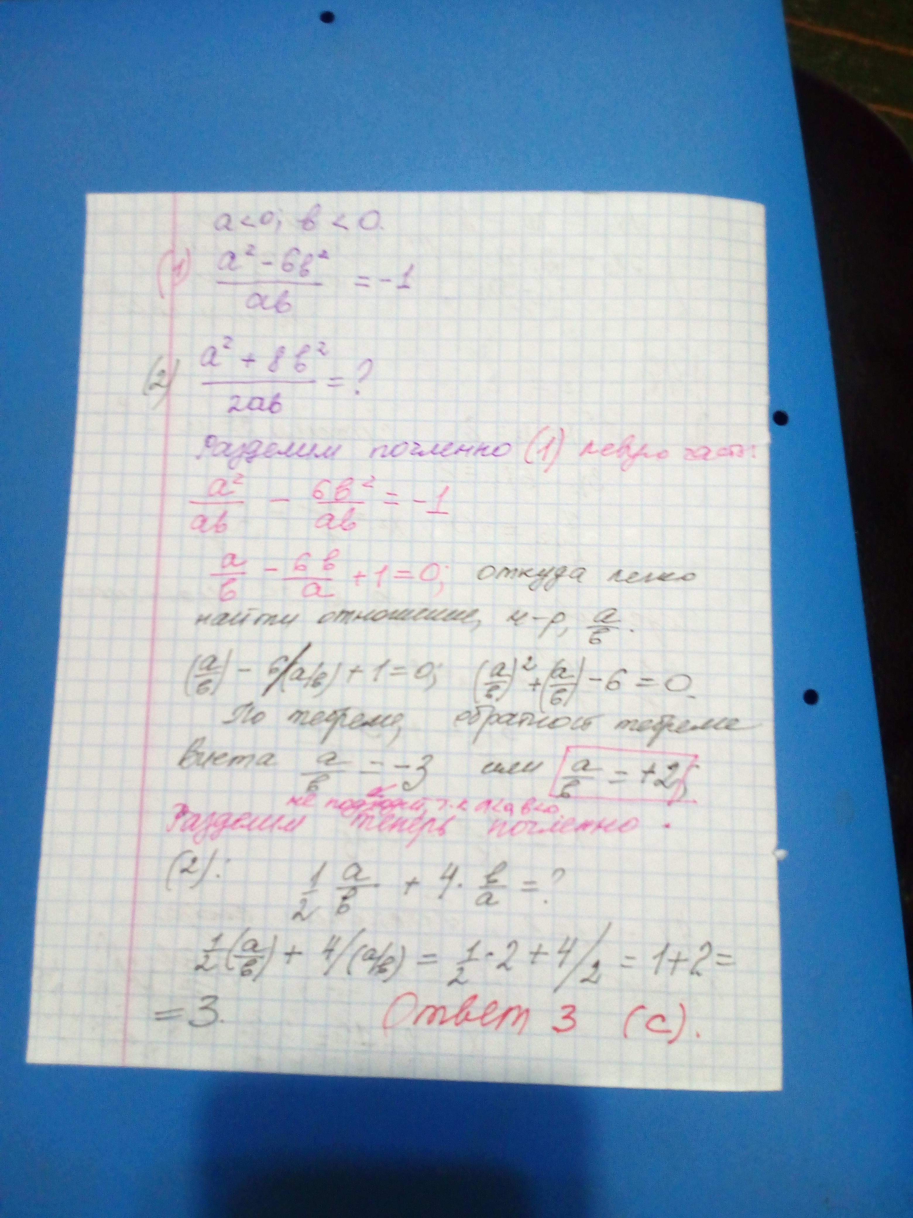 про від'ємні числа a i b відомо що (a^2-6*b^2)/ab=-1.тоді (a^2+8*b^2)/2*a*b дорівнює?