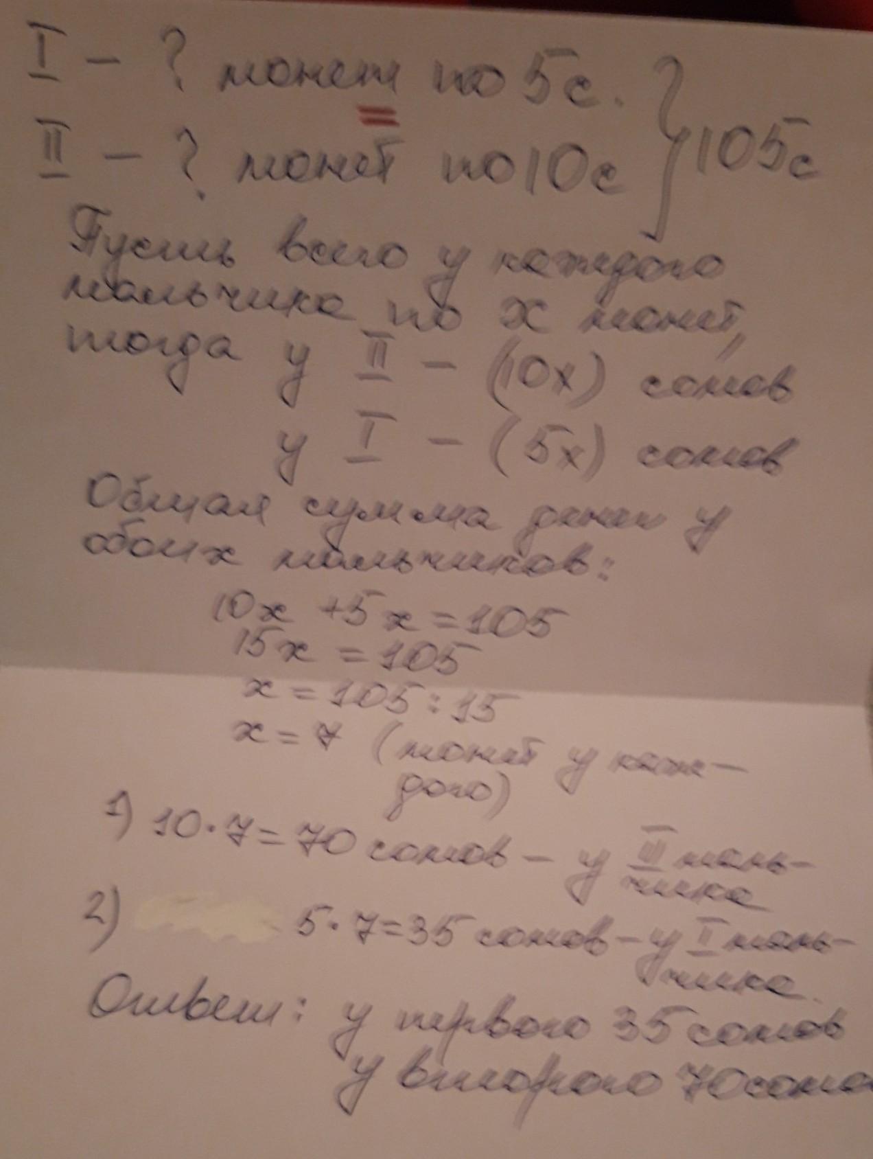 у двух ребят поровну монет. У одного монеты достоинством 5.000 сомов, у второго 10 сумов. У обоих ребят вместе 105 сумов. Во сколько монет у каждого?