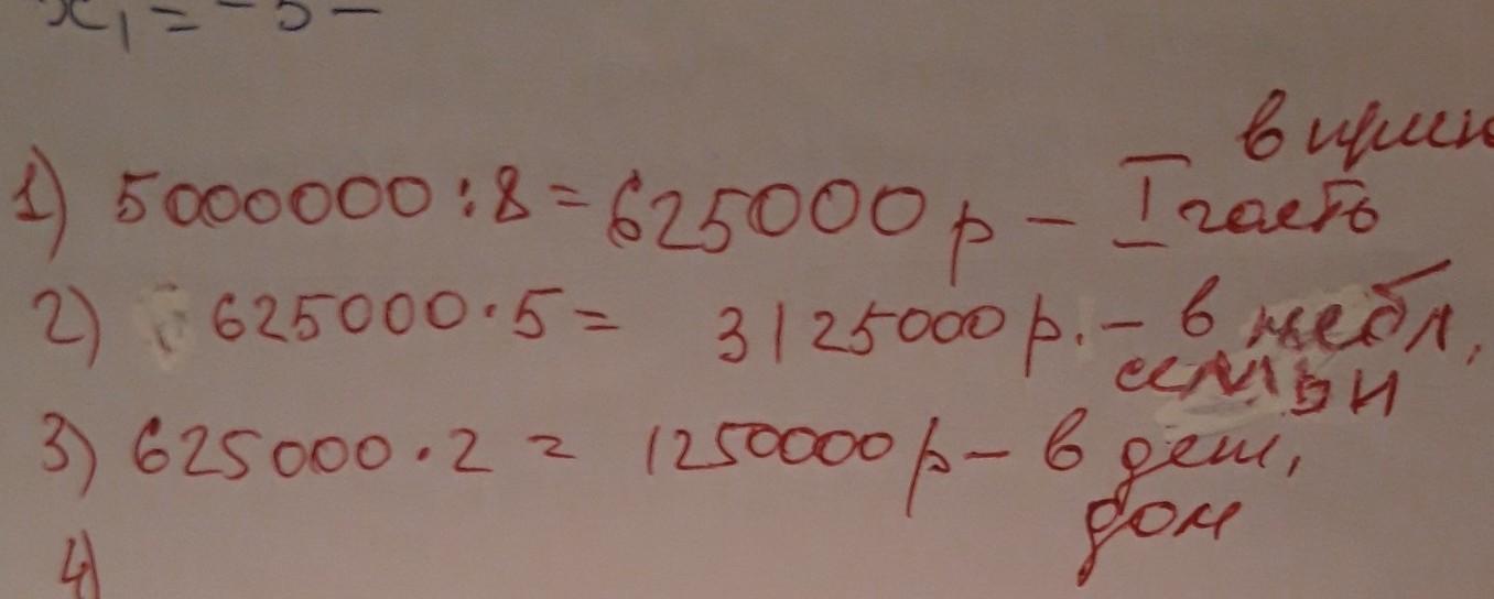 На 1 часть приходится 5 000 000 : 8=625 000 рублей .