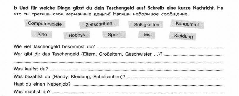 Я получаю 15 евро карманных денег в неделю. Я получаю их от моих дедушки с бабушкой. За них я покупаю журналы, жвачки, мороженое и сладости. Еще я оплачиваю свой мобильный телефон и хобби. Иногда я также хожу в кино. Одежду, спорт и компьютерные игры оплачивают мои родители. К сожалению, у меня нет подработки. Но я хочу ее найти. Я хочу работать курьером.