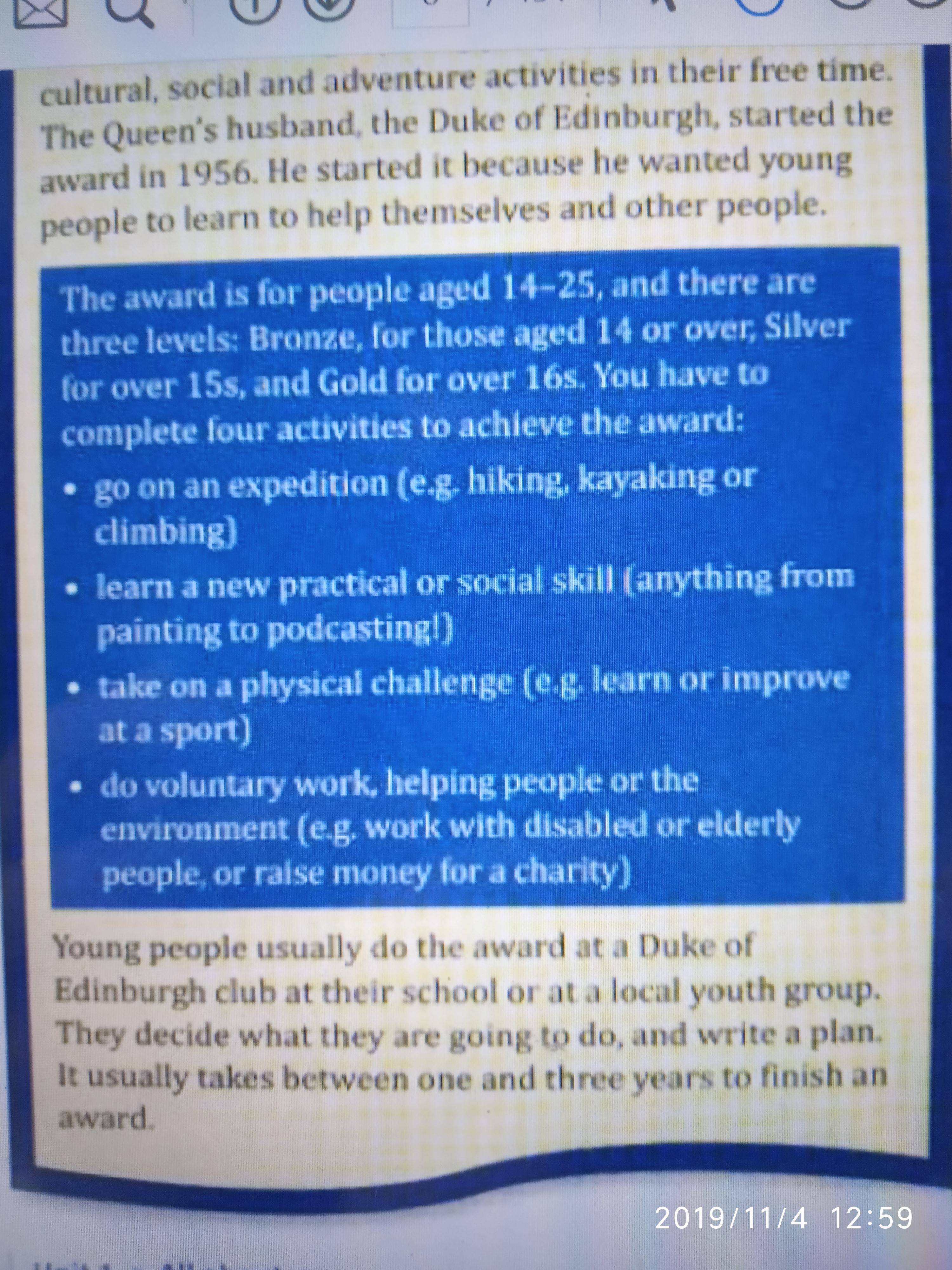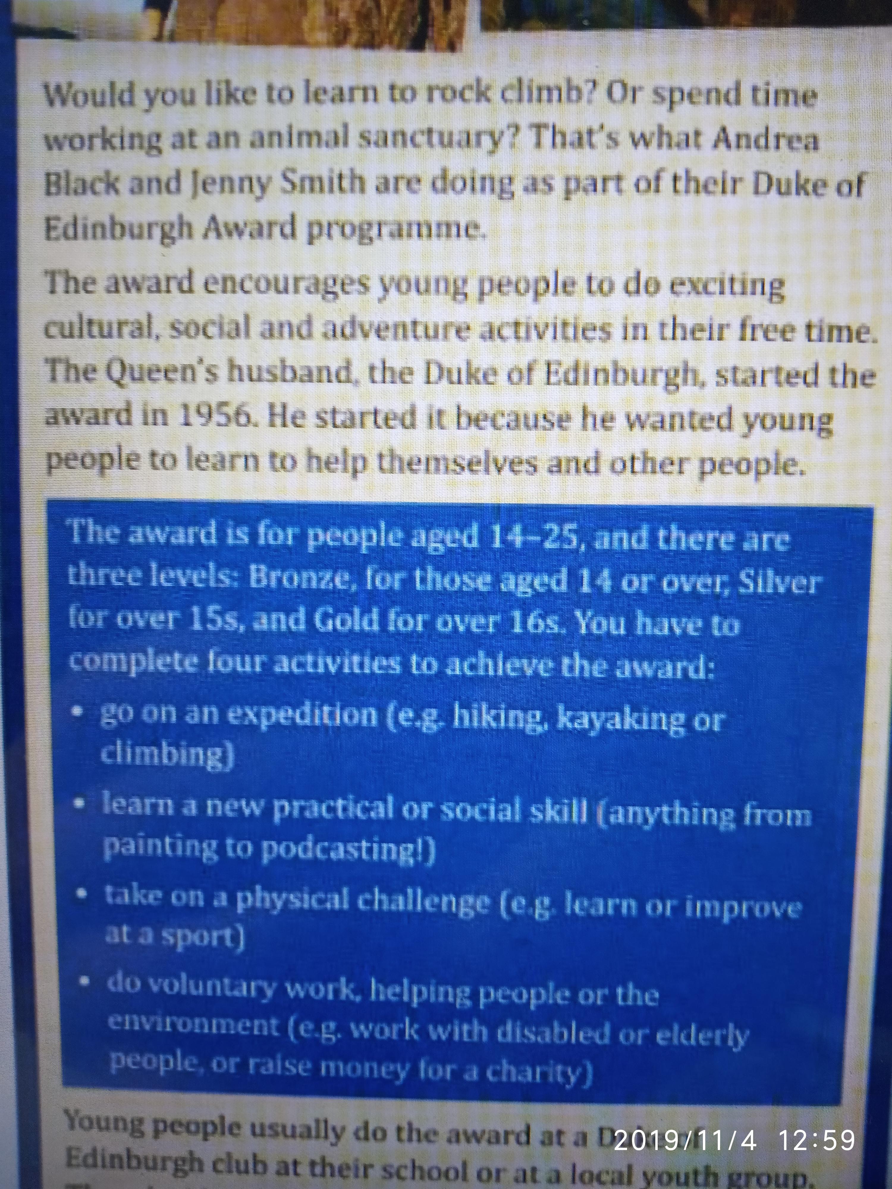 Хотите научиться скалолазанию? Или проводить время за работой в приюте для животных? Именно этим Андреа Блэк и Дженни Смит занимаются в рамках своей программы «Награда герцога Эдинбургского». Эта награда побуждает молодых людей проводить увлекательные культурные, социальные и приключенческие мероприятия в свободное время. Муж королевы, герцог Эдинбургский, учредил эту премию в 1956 году. Он начал ее, потому что хотел, чтобы молодые люди научились помогать себе и другим людям. Награда присуждается людям в возрасте от 14 до 25 лет. Существует три уровня: бронзовый - для лиц в возрасте 14 лет и старше, серебряный - для лиц старше 15 лет и золотой - для лиц старше 16 лет. Чтобы получить награду, вам нужно выполнить четыре задания: отправиться в экспедицию (например, в поход, на байдарке или в лазании), выучить новый практический или социальный навык (что угодно, от рисования до подкастинга!), Принять физический вызов (например, учиться или совершенствоваться в спорте, заниматься волонтерской работой, помогая людям или окружающей среде (например, работа с инвалидами или людьми, или собирать деньги на благотворительность)).Молодые люди обычно делают награду в клубе герцога Эдинбургского в своей школе или в местной молодежной группе.Они решают, что они собираются делать, и пишут план. Обычно на получение награды уходит от одного до трех лет.