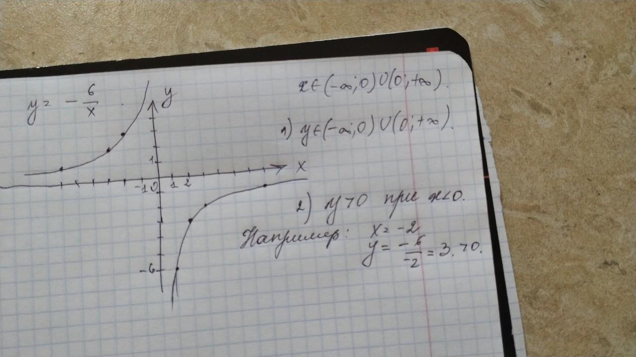 Постройте график функции y=-6/x.Какова область определения функции?При каких значениях x функция принимает положительные значения?