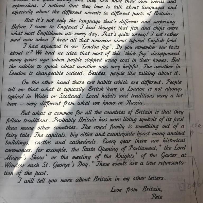 Но это не только язык, который отличается и удивляет. До приезда в Англию Джей считал, что рыба и Чили-это то, что большинство англичан едят каждый день. Это совершенно неправильно! Я уже начинаю злиться, когда слышу всю эту чепуху про тихую английскую еду. Джей выдохнул, чтобы увидеть "лондонский туман". Ты помнишь наши сообщения об этом? Мы понятия не имели, что большая часть этого густого тумана рассеялась много лет назад, когда использовали уголь в своих домах. Но совет шику о погоде был очень полезен. Погода в Лондоне действительно переменчива. Кроме того, мне нравится говорить об этом. С другой стороны, есть привычки, которые отличаются. скажи мне, что то, что британское здесь, в Лондоне, не всегда тих в Уэльсе или Шотландии. Местные обычаи и традиции здесь сильно отличаются от того, что мы знаем в России. Но общим для всех стран Британии является то, что они следуют традициям. Вероятно, Британия имеет больше живых символов своего хаста, чем многие другие страны. Королевская семья-это что-то из сказки * be. Столицы, крупные города и сельская местность могут похвастаться множеством старинных зданий, замков и соборов. Каждый год проводятся исторические церемонии, например, парламент штата, шоу лорда-мэра* или встреча рыцарей "подвязки" в Виндзоре в День Святого Георгия. Эти события являются истинным отрицанием хаста. Я расскажу вам больше о Британии в других моих письмах.