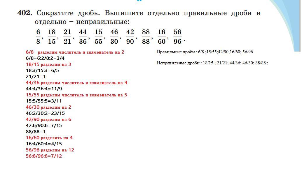 402. Сократите дробь. Выпишите отдельно правельные дроби и отдельно - неправельные: