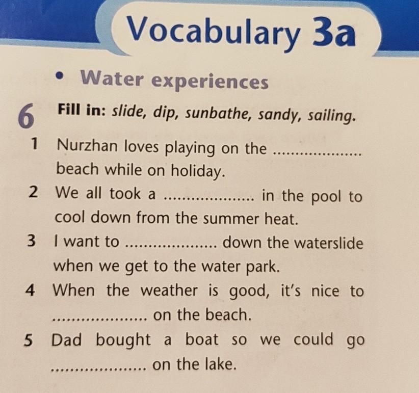 1) sandy 2) dip 3) slide 4) sunbathe 5) sailing