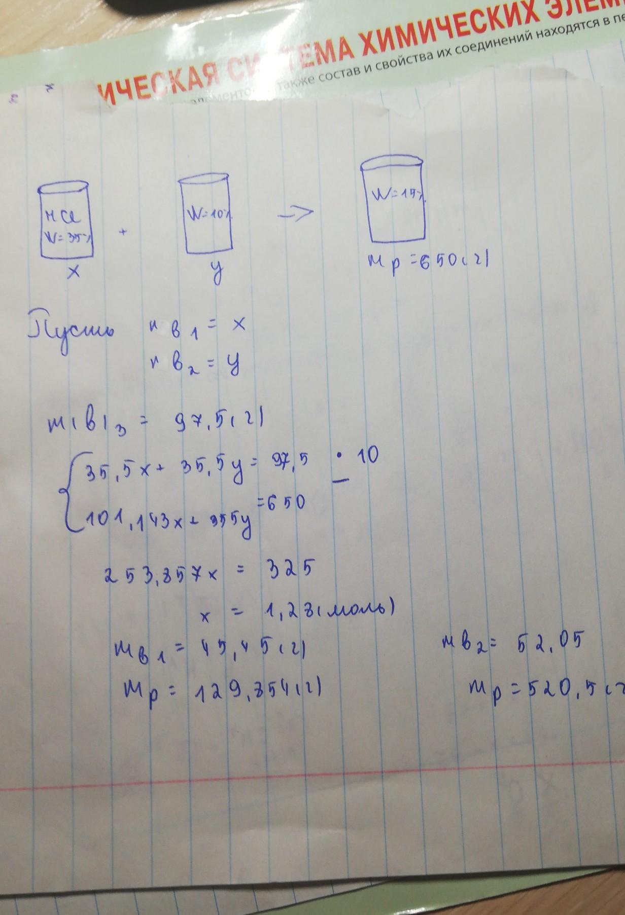 Определите какую массу раствора соляной кислоты с массовой долей 35% и 10% необходимо взять, чтобы получить 15% раствор соляной кислоты массой 650 грамм.