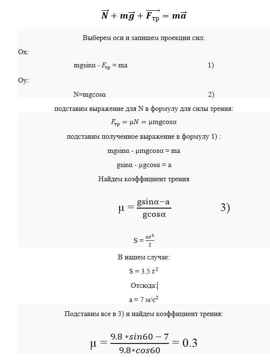 Лыжник съезжает с горы, составляющей угол 60 градусов с горизонтом. Пройденный путь определяется выражением S=3.5t^2. Найдите коэффициент трения лыж о снег.