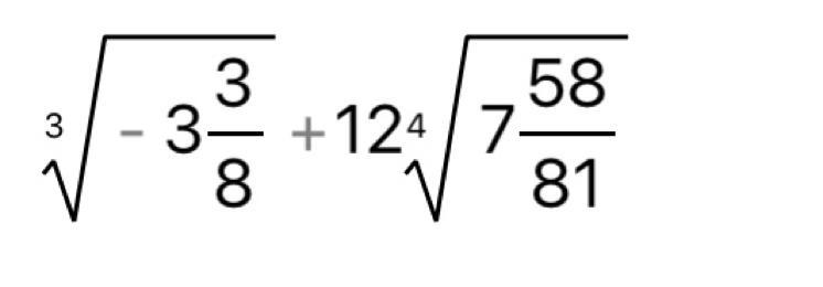\sqrt[3]{-3\frac{3}{8}}+12 \sqrt[4]{7\frac{58}{81}} = \sqrt[3]{-\frac{27}{8}}+12 \sqrt[4]{\frac{625}{81}} =