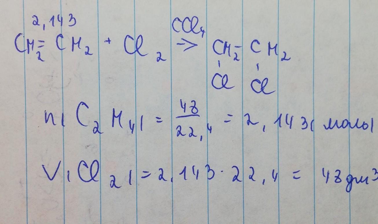 обчислити обєм хлору ,який витрачено на хлорування етену обємом 48л .обєми газів виміряні за однакових умов