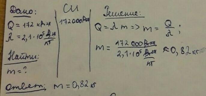 Определите массу меди, если для плавления потребовалось 172 кДж теплоты. Удельная теплота плавления меди равна 2,1⋅105Джкг. (Ответ округлите до сотых).